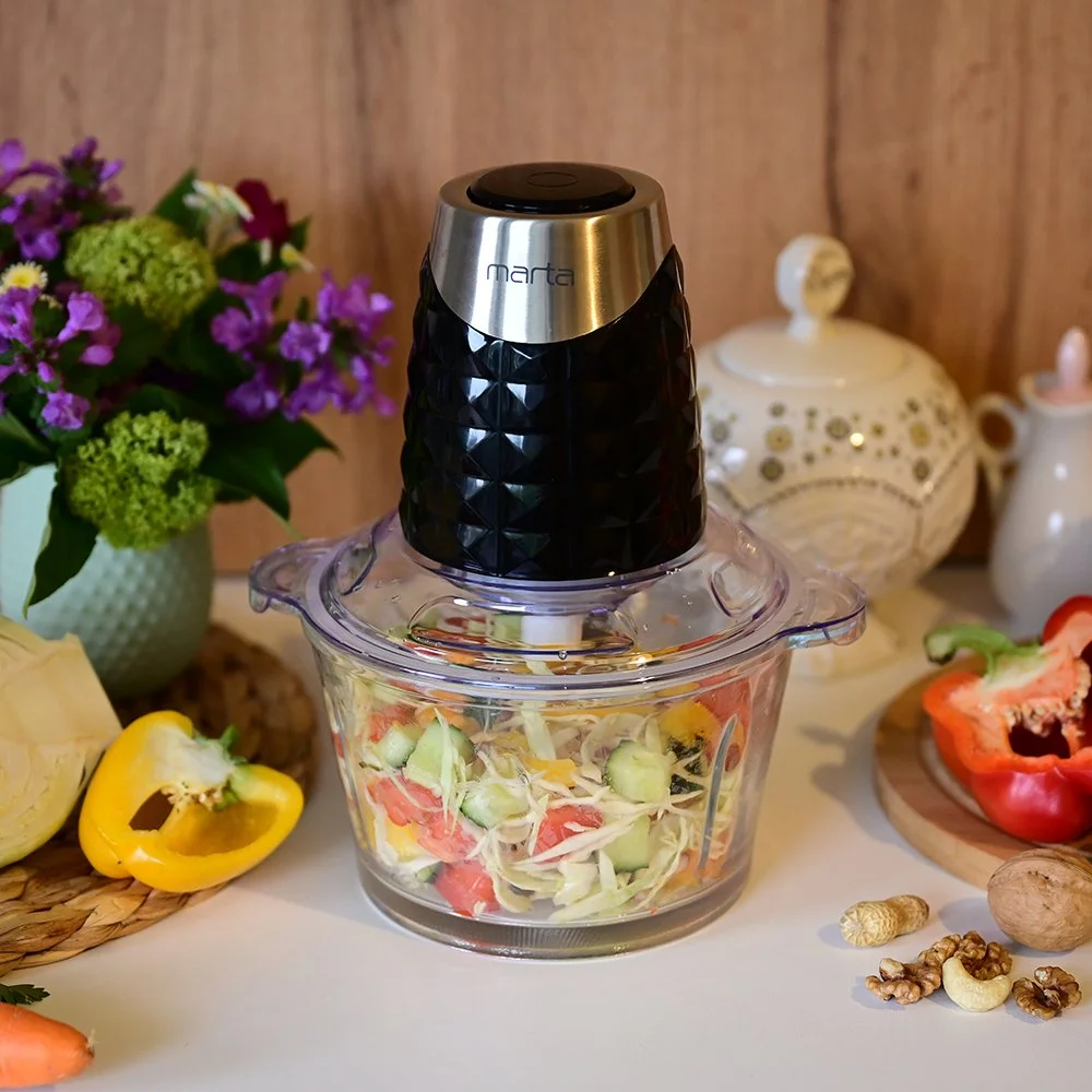 Мощный измельчитель со стеклянной объемом 2 литра. подходит для измельчения, взбивания, смешивания. 2 съёмных ножа из нержавеющей стали не деформируются, не ржавеют, не подвержены коррозии, легко моются и имеют максимально длительный срок службы. Удобен и прост в использовании, занимает при хранении немного места. Емкость чаши 2 л позволяет готовить на всю семью.