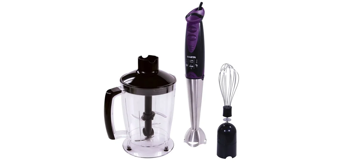 Все самое необходимое в комплекте: венчик для взбивания, металлическая насадка блендер, измельчитель с прозрачной чашей.