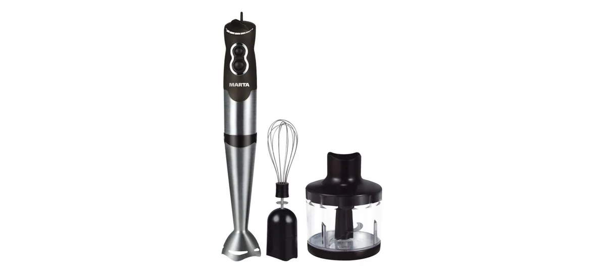 Все самое необходимое в комплекте: венчик для взбивания, металлическая насадка блендер, измельчитель с прозрачной чашей.