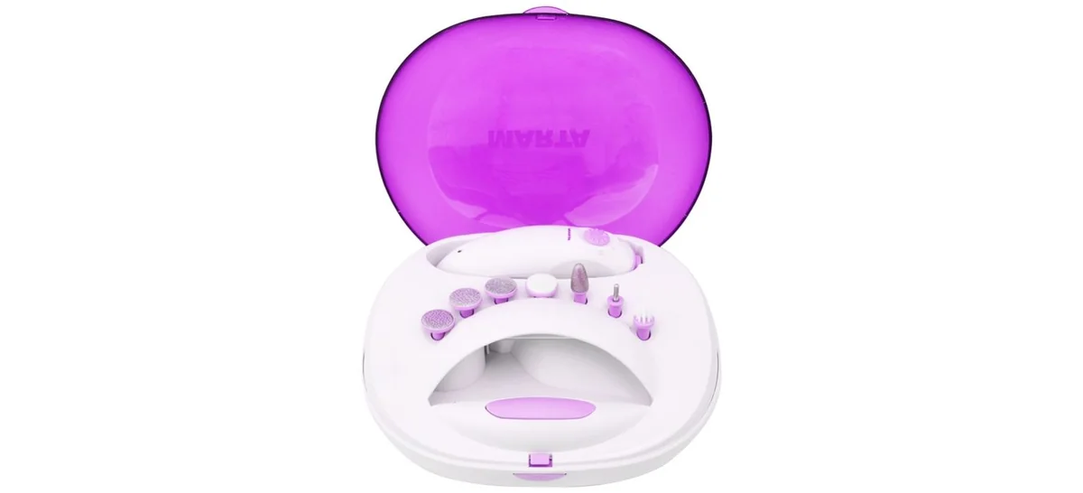 Маникюрно-педикюрный набор с семью различными насадками, с возможностью выбора скорости их вращения и встроенной сушкой для ногтей.