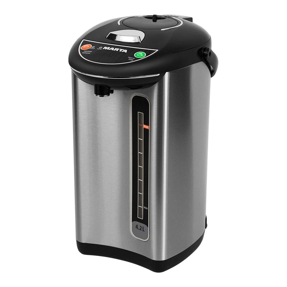 Компактный термопот емкостью 4,2 литра с удобной панелью управления и функцией поддержания температуры. Три режима работы – автокипячение, поддержание температуры и режим повторного кипячения позволяют использовать термопот с наименьшими энергозатратами, при этом горячая вода или кипяток - всегда под рукой. Благодаря корпусу из нержавеющей стали и закрытому нагревательному элементу термопот обладает значительной прочностью и экологически чист - нержавеющая сталь не имеет запаха и сохраняет природные натуральные свойства воды. Плоское дно термопота с закрытым нагревательным элементом очень функционально – легко моется, противостоит накипи, не ржавеет, не корродирует, а значит, обеспечивает термопоту максимально долгий срок службы. Блокировка помпы ручного насоса управления и многоуровневая защита обеспечивает полную безопасность использования термопота.