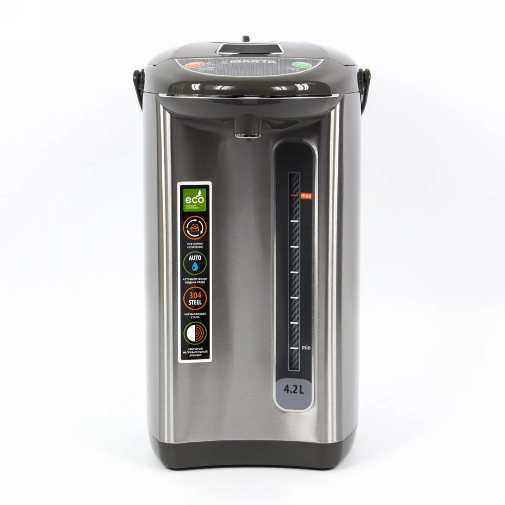 Компактный термопот емкостью 4,2 литра с удобной панелью управления и функцией поддержания температуры. Три режима работы – автокипячение, поддержание температуры и режим повторного кипячения позволяют использовать термопот с наименьшими энергозатратами, при этом горячая вода или кипяток - всегда под рукой. Благодаря корпусу из нержавеющей стали и закрытому нагревательному элементу термопот обладает значительной прочностью и экологически чист - нержавеющая сталь не имеет запаха и сохраняет природные натуральные свойства воды. Плоское дно термопота с закрытым нагревательным элементом очень функционально – легко моется, противостоит накипи, не ржавеет, не корродирует, а значит, обеспечивает термопоту максимально долгий срок службы. Блокировка помпы ручного насоса управления и многоуровневая защита обеспечивает полную безопасность использования термопота.