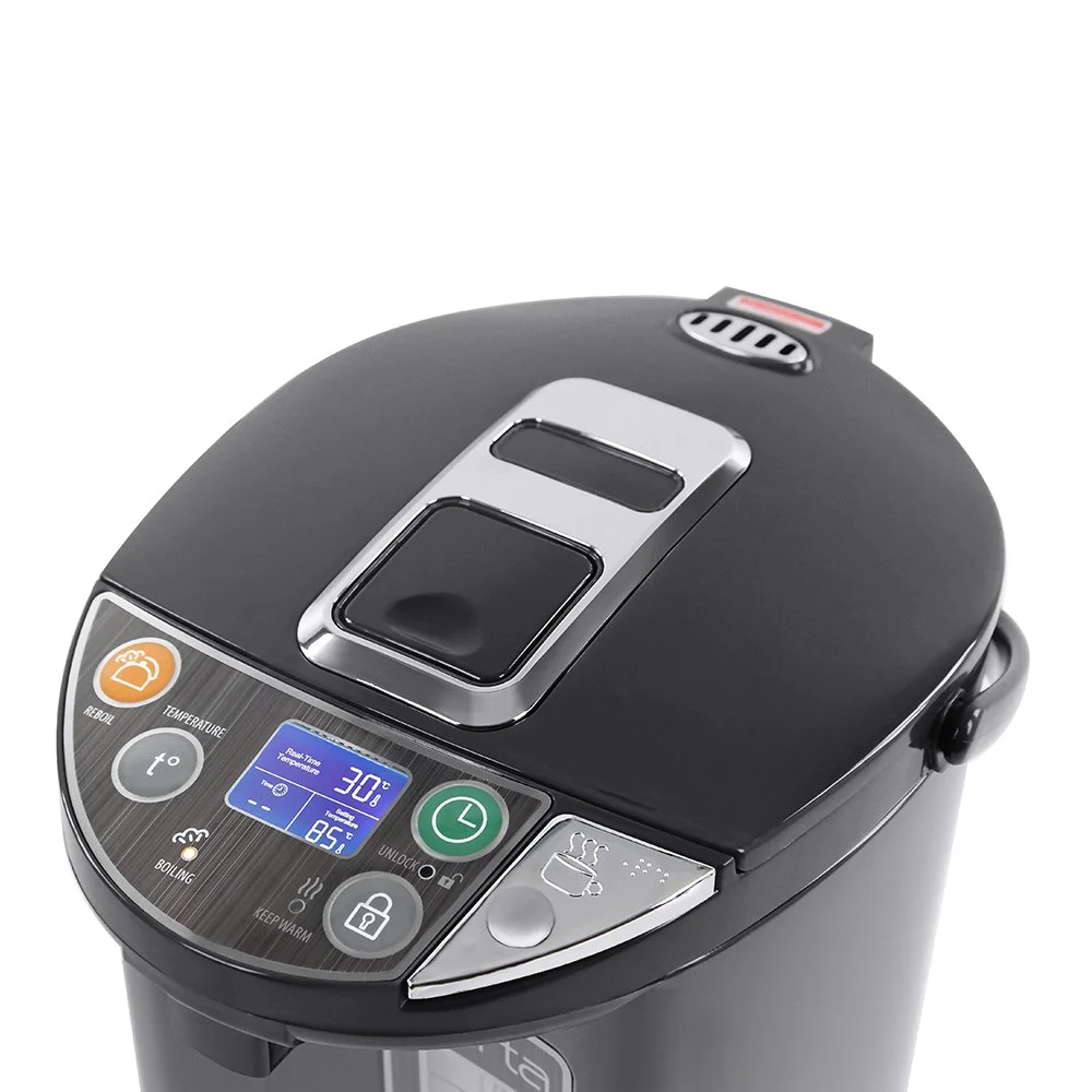 Компактный термопот емкостью 4,2 литра с удобной панелью управления и функцией поддержания температуры. Три режима работы – автокипячение, поддержание температуры и режим повторного кипячения позволяют использовать термопот с наименьшими энергозатратами, при этом горячая вода или кипяток - всегда под рукой. Благодаря корпусу из нержавеющей стали и закрытому нагревательному элементу термопот обладает значительной прочностью и экологически чист - нержавеющая сталь не имеет запаха и сохраняет природные натуральные свойства воды. Плоское дно термопота с закрытым нагревательным элементом очень функционально – легко моется, противостоит накипи, не ржавеет, не корродирует, а значит, обеспечивает термопоту максимально долгий срок службы. Блокировка помпы ручного насоса управления и многоуровневая защита обеспечивает полную безопасность использования термопота.