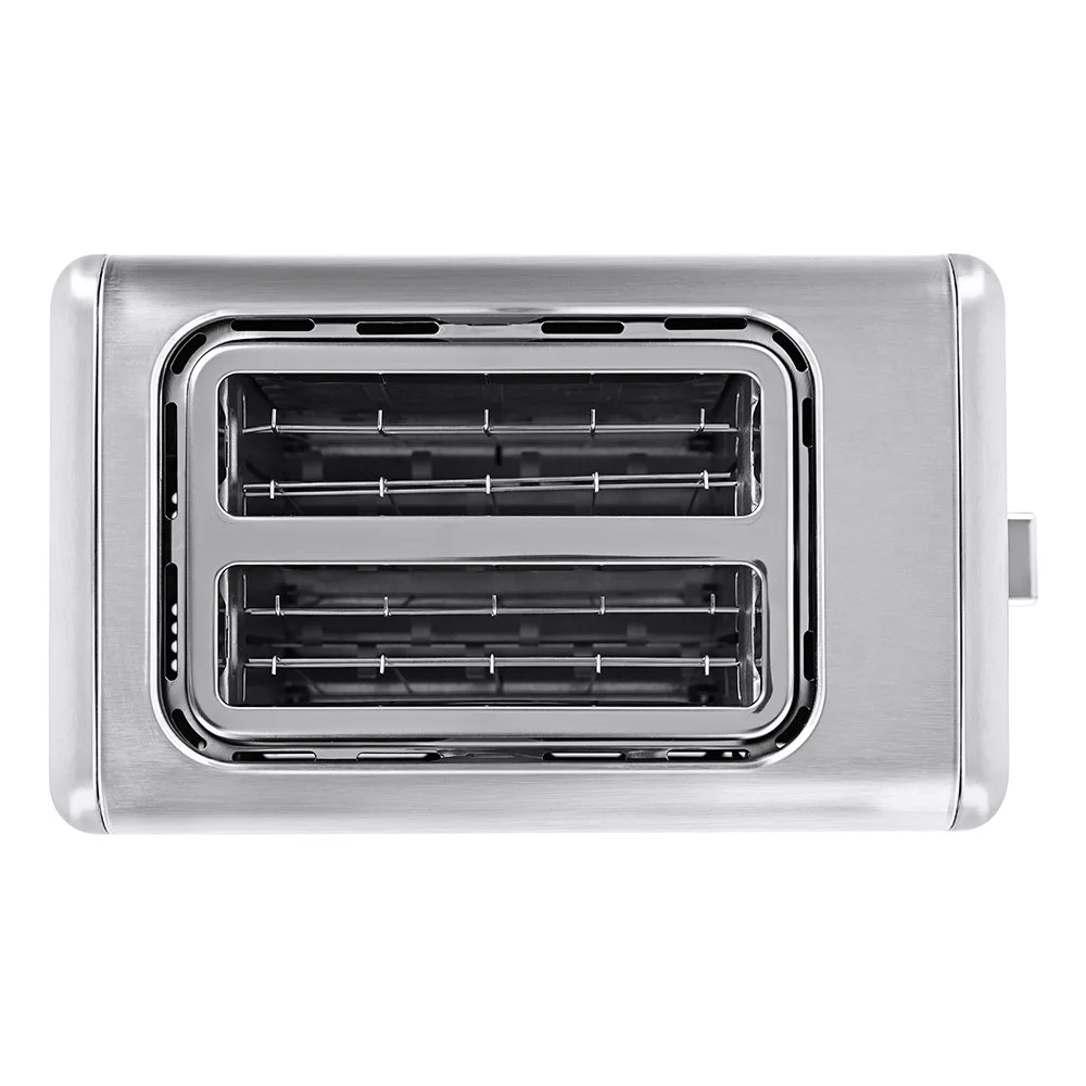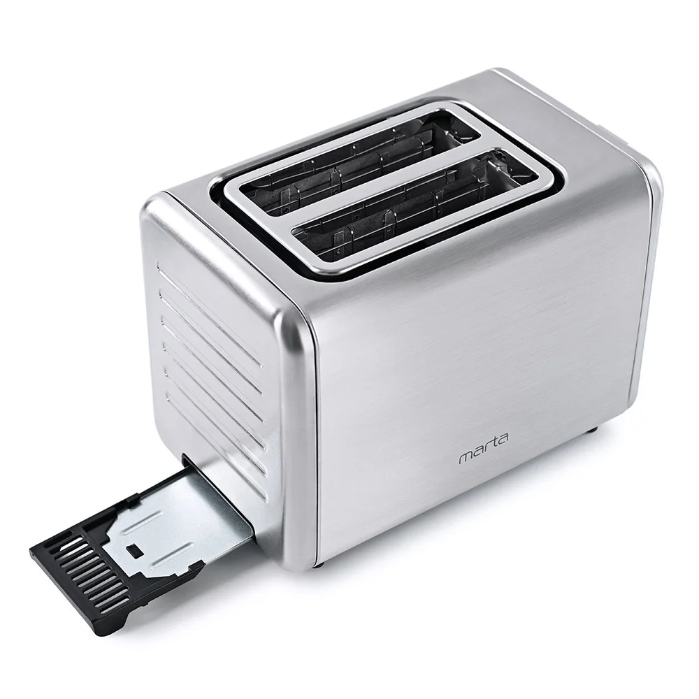 Тостер оснащен двумя отсеками для одновременного обжаривания двух кусочков хлеба, а съемный поддон для крошек существенно упрощает его очистку.