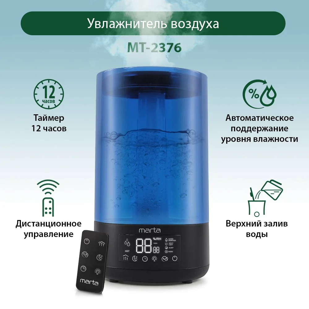 Увлажнитель воздуха MT-2376 бесшумно нормализует уровень влажности в помещении до идеального. Вы почувствуете разницу очень скоро, ведь от уровня влажности зависит и степень вашей работоспособности, и качество отдыха.