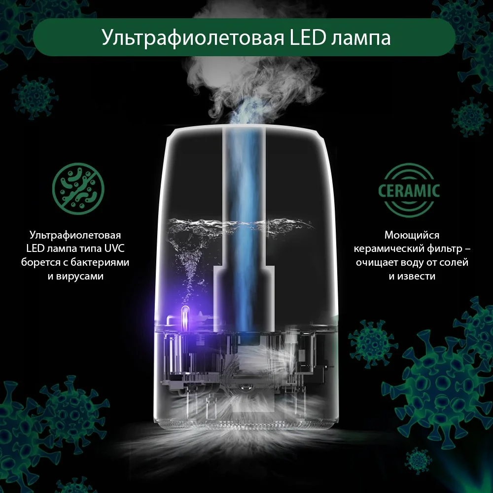 Ультрафиолетовая дезинфекция нейтрализует 99.9% болезнетворных микроорганизмов, спор и грибков содержащихся в воде, что значительно снижает риск вирусных заболеваний при использовании увлажнителя.