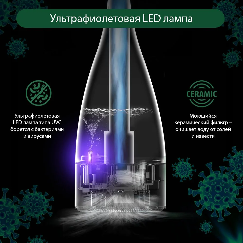 Ультрафиолетовая дезинфекция нейтрализует 99.9% болезнетворных микроорганизмов, спор и грибков содержащихся в воде, что значительно снижает риск вирусных заболеваний при использовании увлажнителя.