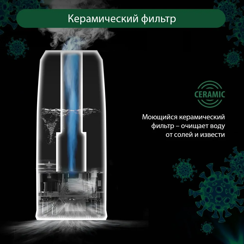 Воздухозаборный отсек имеет фильтрующий картридж. Сетка картриджа содержит активированный уголь, задерживает находящуюся в воздухе пыль и очищает его. Очищенный воздух смешивается с мелкодисперсным водяным паром, увлажняя помещение. Фильтр обслуживаемый, его можно помыть и использовать снова.