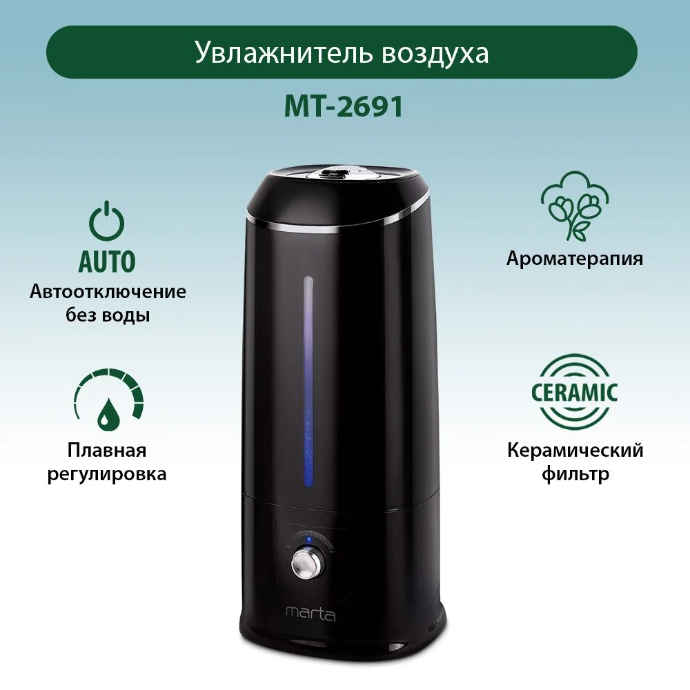 Увлажнитель воздуха MT-2691 бесшумно нормализует уровень влажности в помещении до идеального уровня. Вы почувствуете разницу очень скоро, ведь от уровня влажности зависит и степень вашей работоспособности, и качество отдыха.