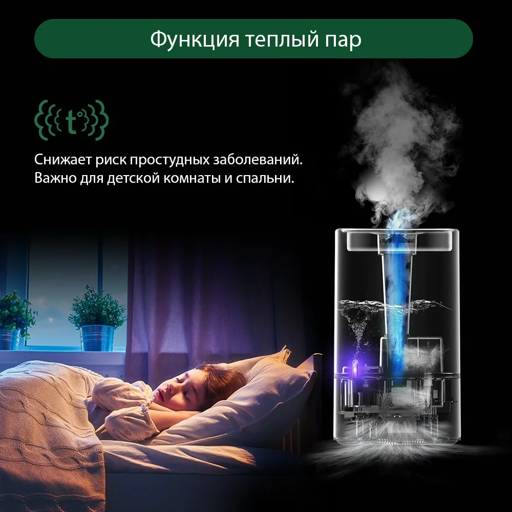 Теплый воздух – теплый пар предотвращает понижение температуры при использовании увлажнителя. Нагретый пар быстрее увлажняет воздух в помещении из – за лучшей конвективности, создавая идеальный баланс температуры и влажности.