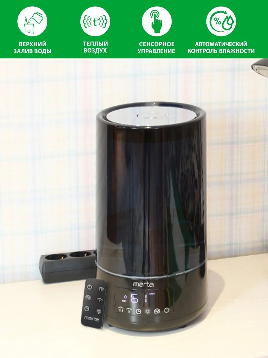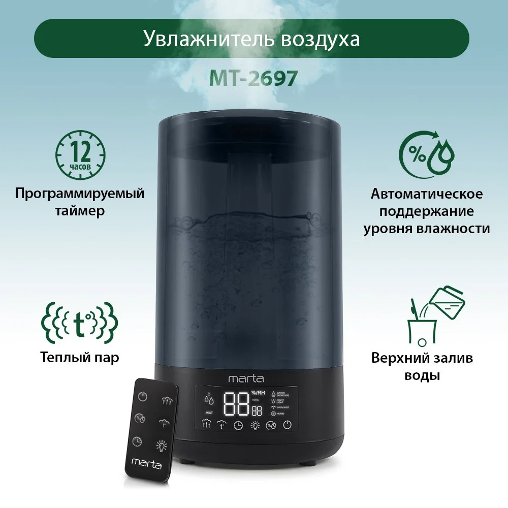 Увлажнитель воздуха MT-2697 бесшумно нормализует уровень влажности в помещении до идеального. Вы почувствуете разницу очень скоро, ведь от уровня влажности зависит и степень вашей работоспособности, и качество отдыха.