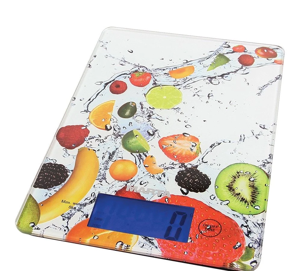 Яркие кухонные весы с красивой и прочной поверхностью из закаленного стекла, функцией «ТАРА» и жидкокристаллическим дисплеем с подсветкой.