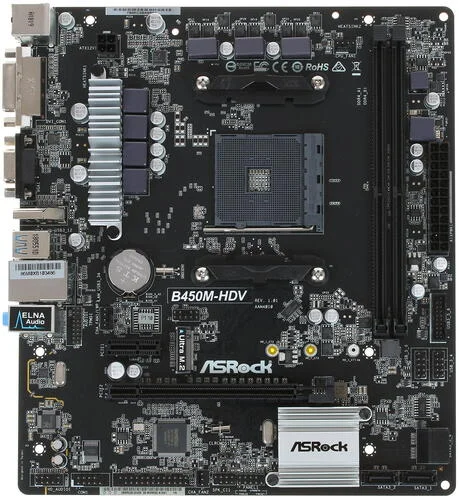 Материнская плата ASRock B450M-HDV станет отличным компаньоном для процессора от фирмы AMD. Для его подключения используется сокет AM4. Для видеокарты предусмотрен защищенный от помех слот PCI-E x16. Благодаря поддержке звука Realtek HD Audio и применения звуковой схемы 7.1 вам гарантировано качественное и насыщенное звуковое сопровождение с эффектом объемного звучания.