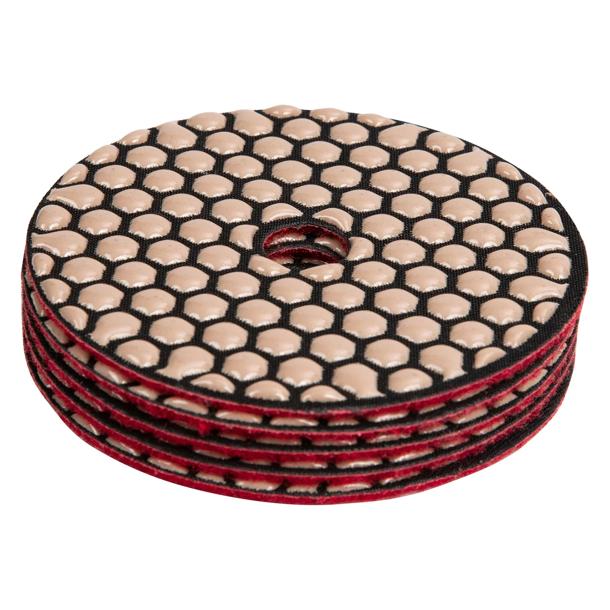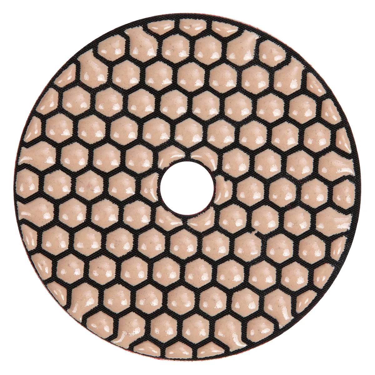 Алмазный гибкий шлифовальный круг Matrix 73501 диаметром 100 мм, с зернистостью P 100, 5 шт. в упаковке, предназначен для сухого шлифования преимущественно белых и цветных поверхностей из гранита, мрамора, природного и искусственного камня, керамогранита. Абразив с зернистостью P 100 снимает большой слой материала и используется для черновой шлифовки. Гибкость круга упрощает обработку предметов сложной формы. Круг используется на УШМ с установленной опорной тарелкой для АГШК.ПреимуществаРабочая поверхность отличается высокой концентраций алмазов, а в качестве связки использован качественный термопластик, благодаря чему круг устойчив к износу и высоким температурам, обладает высоким рабочим ресурсом.Рабочая поверхность состоит из круглых сегментов с промежутками между ними - «черепашка» обеспечивает эффективный отвод шлама в процессе шлифовки без применения охлаждающей жидкости.Система крепления velcro позволяет моментально закрепить круг на липучке опорной тарелки.В упаковке 5 штук, которых хватит для выполнения большого объема работ.