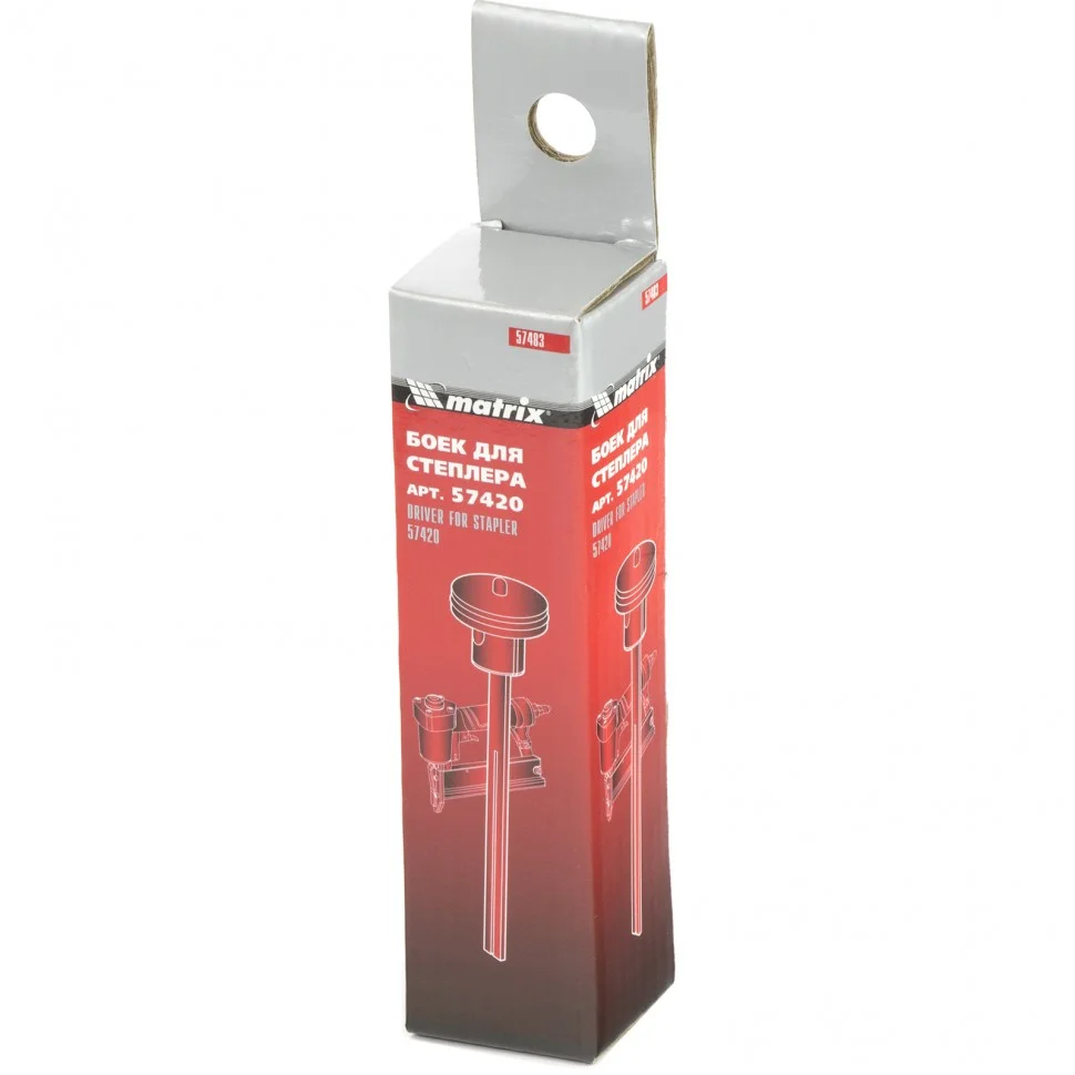 Боек Matrix 57483 предназначен для установки на пневматический степлер 57420. Снабжен уплотнительным кольцом, обеспечивающим стабильную работу инструмента при давлении до 10 МПа и температуре воздуха до -20 градусов C.ПреимуществаПрочность и высокий ресурс — стальной боек твердостью не менее 45 HRC выдерживает ударные нагрузки, устойчив к коррозии и механическим повреждениям.Эффективная работа — идеальная геометрия бойка исключает заклинивание и поломку скоб.Вес 320 г — боек не утяжеляет конструкцию степлера, что позволяет долго работать без усталости.