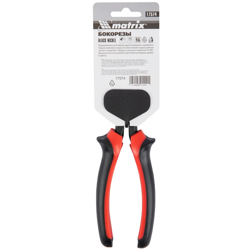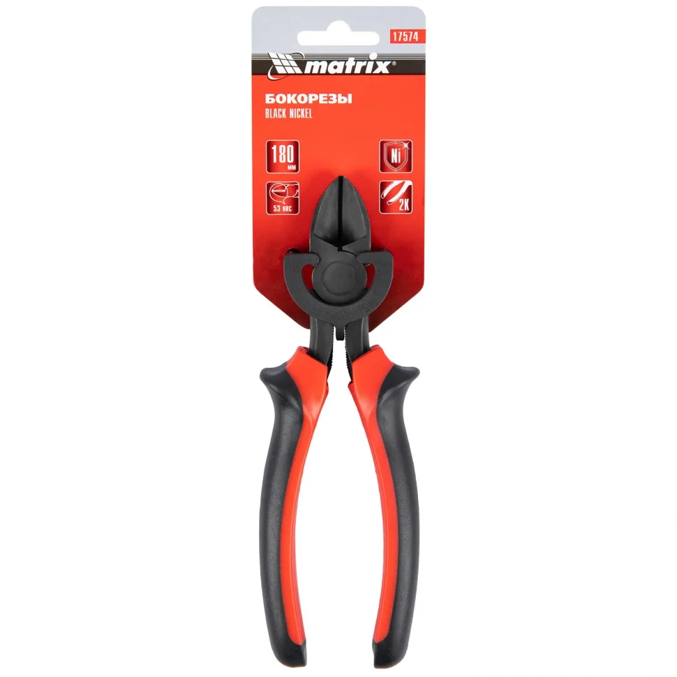 Классические бокорезы Matrix Black Nickel 17574, 180 мм, с двухкомпонентными рукоятками, используются для разрезания проводов, кабелей, проволоки и перекусывания гвоздей. Они пригодятся как начинающим мастерам, так и профессионалам при проведении монтажных и ремонтных работ.ПреимуществаУдлиненное шарнирное соединение позволяет выполнять работы с минимальными усилиями.Губки из качественной углеродистой стали 45 твердостью 53 HRC отличаются прочностью и высоким ресурсом.Защита от коррозии и износоустойчивость — на рабочие части нанесено черное никелевое покрытие.Двухкомпонентные эргономичные рукоятки обеспечивают надежный хват, что повышает удобство работы.Упоры на рукоятках делают работу с инструментом безопасной, т.к. предотвращают соскальзывание руки к режущим элементам.