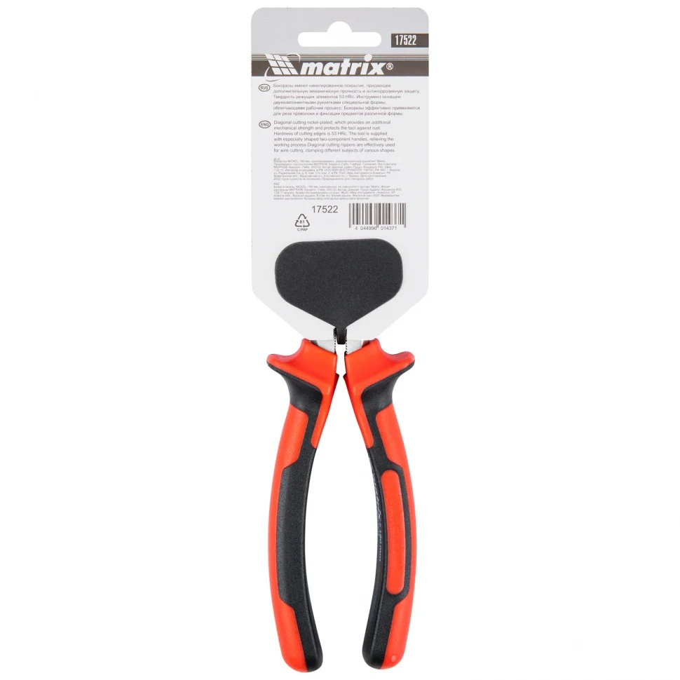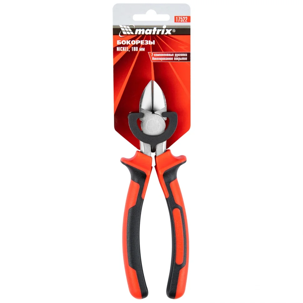 Бокорезы Matrix NICKEL 17522, 180 мм, с никелированным покрытием и двухкомпонентными рукоятками, используются для перекусывания проводов и проволоки. Они пригодятся при проведении монтажных, строительных и слесарных работ не только частным, но и профессиональным мастерам.ПреимуществаБокорезы покрыты никелем, что обеспечивает высокую стойкость к коррозии и износу.Рабочие кромки прошли закалку высокочастотными токами до твердости 53 HRC, это позволило увеличить эффективность резки даже при работе с твердыми материалами.Двухкомпонентные рукоятки обеспечивают надежный захват, даже если мастер испачкает руки в масле.Выступы на рукоятках предотвращают соскакивание руки к металлическим частям инструмента.