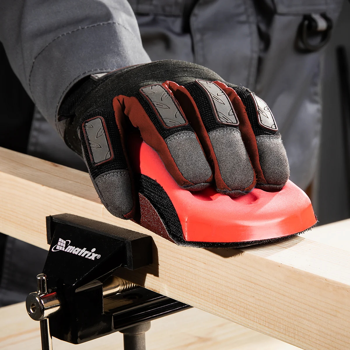 Брусок для шлифования Matrix 75812, 125 мм, с «липучкой», используется для обработки металла, древесины, камня и пластмассы при проведении ремонтных, отделочных, малярных работ. Он позволяет надежно зафиксировать абразивные круги (диски) на ворсовой основе диаметром 125 мм. Брусок является альтернативой шлифовальной машинке.ПреимуществаБлагодаря креплению «велкро» шлифдиск крепко держится на бруске даже при интенсивных нагрузках.Шлифовальный круг крепится не только на основание, но и на боковые части бруска, это делает брусок более универсальным.Подпальцевые выемки обеспечивают удобный захват бруска и комфортную шлифовку даже при большом объеме работ.Брусок выполнен из противоударного полипропилена, практически не подвержен температурным перепадам и потере цвета.Вес 79 г — можно долго работать с бруском, не ощущая усталости.