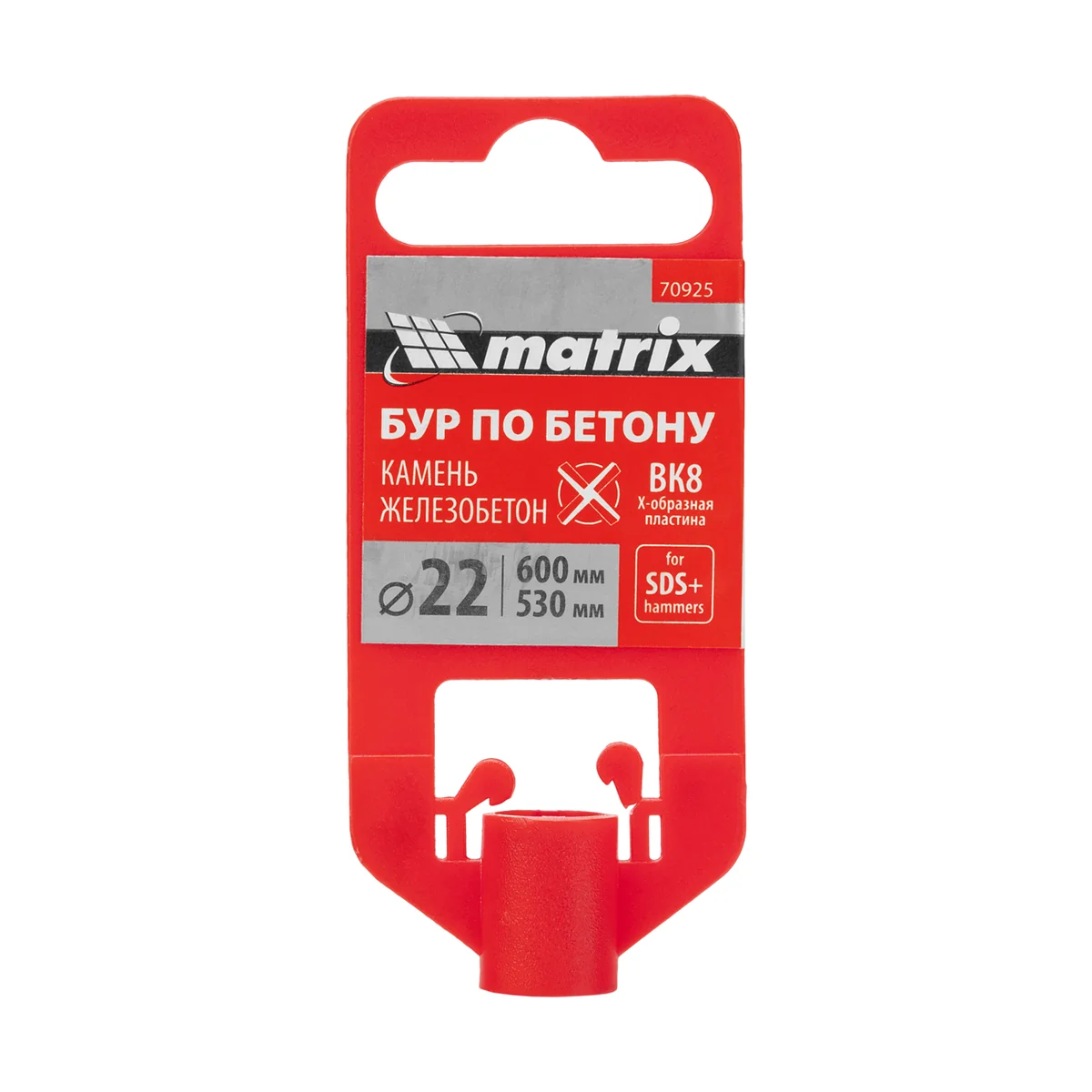 Бур по бетону Matrix 70925 длиной 600 мм, с хвостовиком SDS-plus и крестовой пластиной, предназначен для получения отверстий диаметром 22 мм в бетоне, камне и кирпиче. Крестовая пластина обеспечивает эффективную работу с твердыми материалами, в том числе армированным бетоном. Бур устанавливается в патрон перфоратора и используется во время проведения строительных работ.