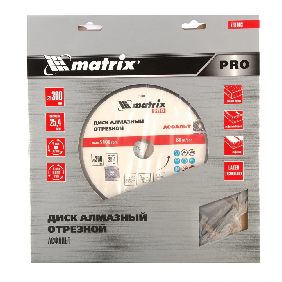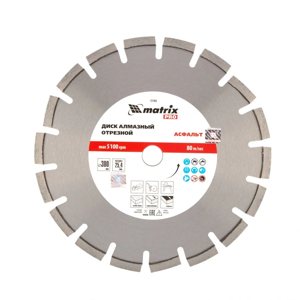 Диск алмазный Matrix PRO «Асфальт» 731063, ф300 х 25,4 мм, используется для сухого и мокрого реза асфальта, свежего бетона, асфальтобетона, камня, кирпича, абразивных материалов. Он применяется в качестве оснастки для ручных бензорезов или швонарезчиков с посадочным местом 25,4 мм. Диск устойчив к деформациям и выдерживает значительные нагрузки, поэтому имеет высокий рабочий ресурс. Мокрое резание рекомендуется проводить для увеличения ресурса диска.ПреимуществаСегментное строение - в процессе реза обеспечивается отвод тепла и шлама, что повышает производительность диска.Износостойкость - конструкцией круга предусмотрены защитные секторы, предохраняющие сегменты от истирания в месте крепления к корпусу и от налипания асфальтовой крошки на рабочую кромку.Ширина рабочей части 10 мм - производительность остается на стабильно высоком уровне независимо от типа материала (указанного на упаковке).Режущая часть закреплена методом лазерной приварки - алмазы надежно удерживаются на диске.