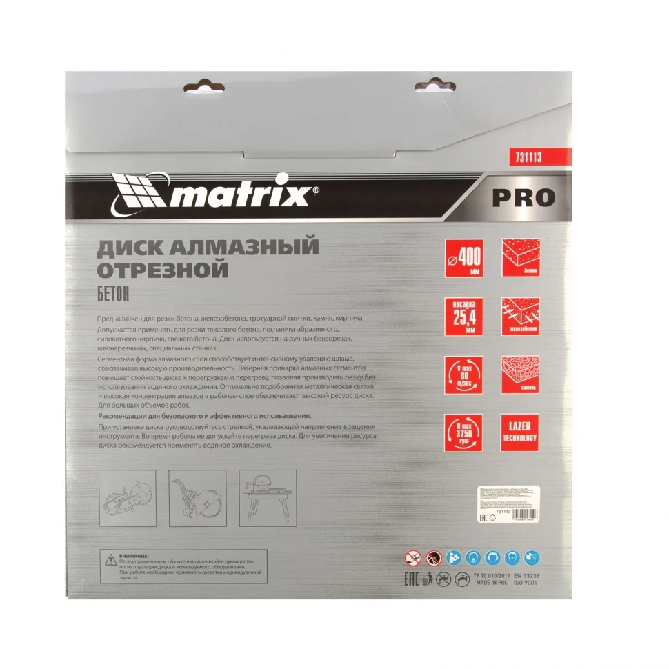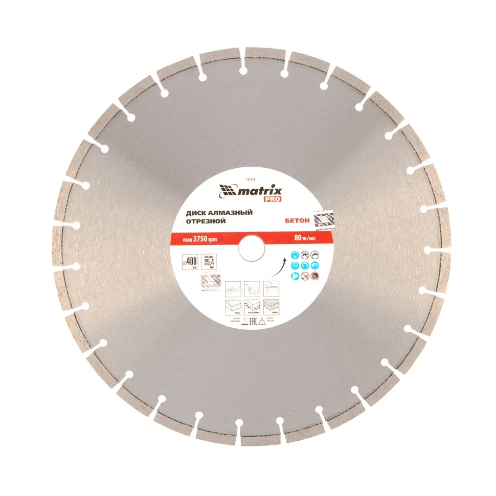 Диск алмазный Matrix PRO «Железобетон» 731113, ф400 х 25,4 мм, используется с профессиональными швонарезчиками, ручными бензорезами и специальными станками для сухого и мокрого реза различных материалов. Позволяет работать по тяжелому и армированному бетону, камню, тротуарной плитке, силикатному кирпичу, абразивному песчанику и другим особо твердым материалам. Диск характеризуется высокой производительностью и подходит для интенсивного применения.ПреимуществаАлмазные сегменты приварены лазером, поэтому выдерживают сверхнагрузки и сохраняют работоспособность даже при резке армированного бетона.Благодаря сегментному строению, обеспечивающему охлаждение и отвод шлама, диск может работать как с водяным охлаждением, так и без него.Увеличенная концентрация алмазов в рабочем слое и ширина режущей части 10 мм повышают производительность и ресурс диска.Оптимальное соотношение компонентов в металлической связке обеспечивает высокие режущие свойства, стойкость к перегреву и перегрузкам.