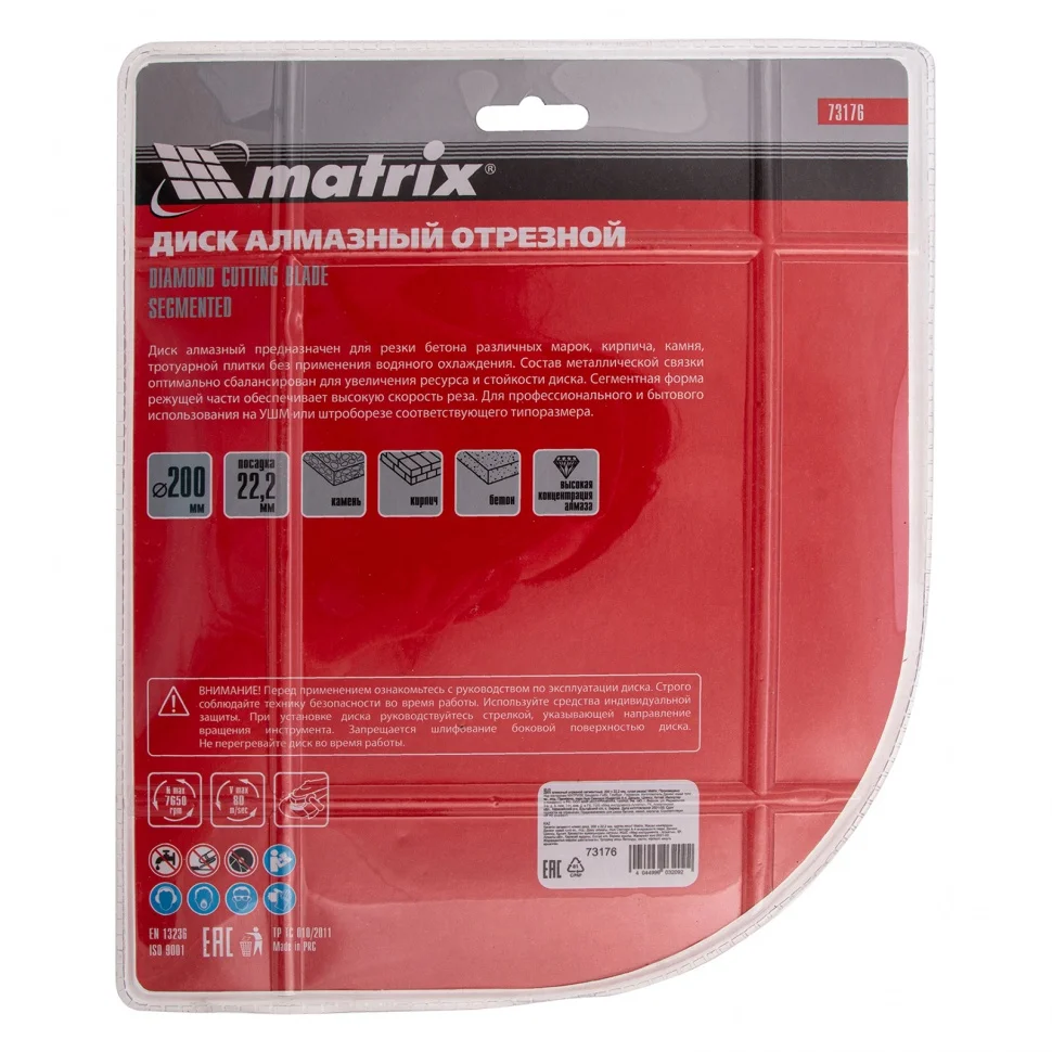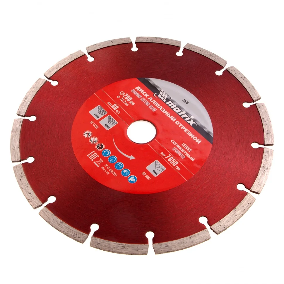 Отрезной алмазный диск Matrix 73176, 200 х 22,2 мм, предназначен для сухой резки натурального и искусственного камня, кирпича, свежего и твердого бетона. Он применяется с углошлифовальными машинами соответствующего типоразмера. Благодаря высокой скорости реза диск позволяет выполнять работы большого объема. Он пригодится на небольших строительных площадках и будет идеальным помощником при решении бытовых задач.ПреимуществаУвеличенный рабочий ресурс - диск отличается оптимально подобранной металлической связкой и высокой концентрацией алмазов.Высокая производительность без водяного охлаждения - ширина рабочей части 7 мм и прорези между сегментами обеспечивают охлаждение и отвод шлама.Устойчивость к нагрузкам - диск изготовлен по технологии холодного прессования и выдерживает сильные механические воздействия.