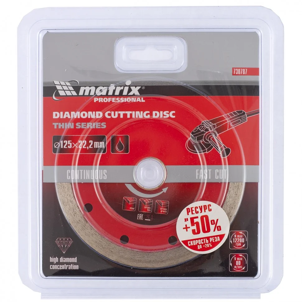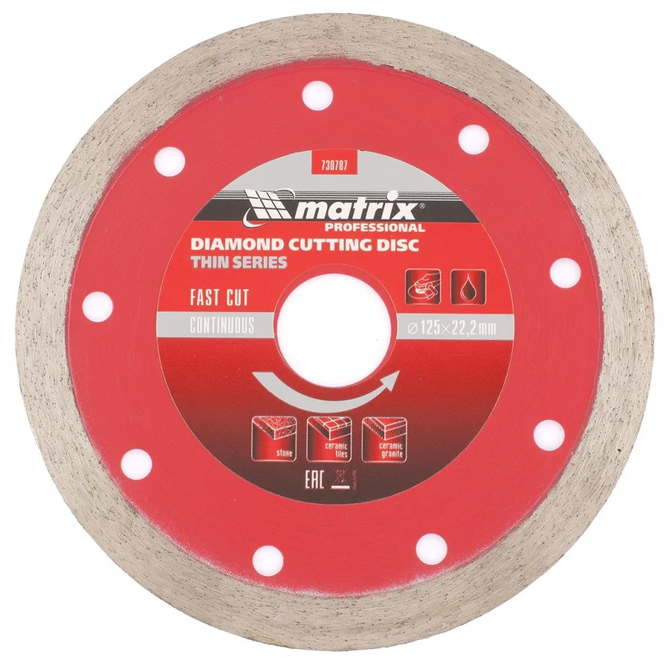 Отрезной сплошной алмазный диск Matrix ф125х22,2 мм 730787, тонкий, обеспечивает мокрое резание плотных материалов: керамогранита, керамической и кафельной плитки, мрамора, натурального и искусственного камня. Он устанавливается на УШМ или плиткорезы и используется с применением водяного охлаждения. Диск увеличивает производительность на 20% благодаря небольшой толщине 1,5 мм и снижению нагрузки на инструмент.ПреимуществаСплошная форма и перфорированный корпус позволяют добиться высокого качества реза и предотвращают появление сколов.Режущая часть шириной 10 мм с высокой концентрацией алмазов способствуют увеличению рабочего ресурса диска на 50%.Высокий ресурс и износостойкость рабочей части достигается за счет металлической связки.Метод ускоренного горячего прессования улучшает сопротивление режущей части нагрузкам и делает мокрое резание более качественным.Диск может использоваться в бытовых целях и профессионально.