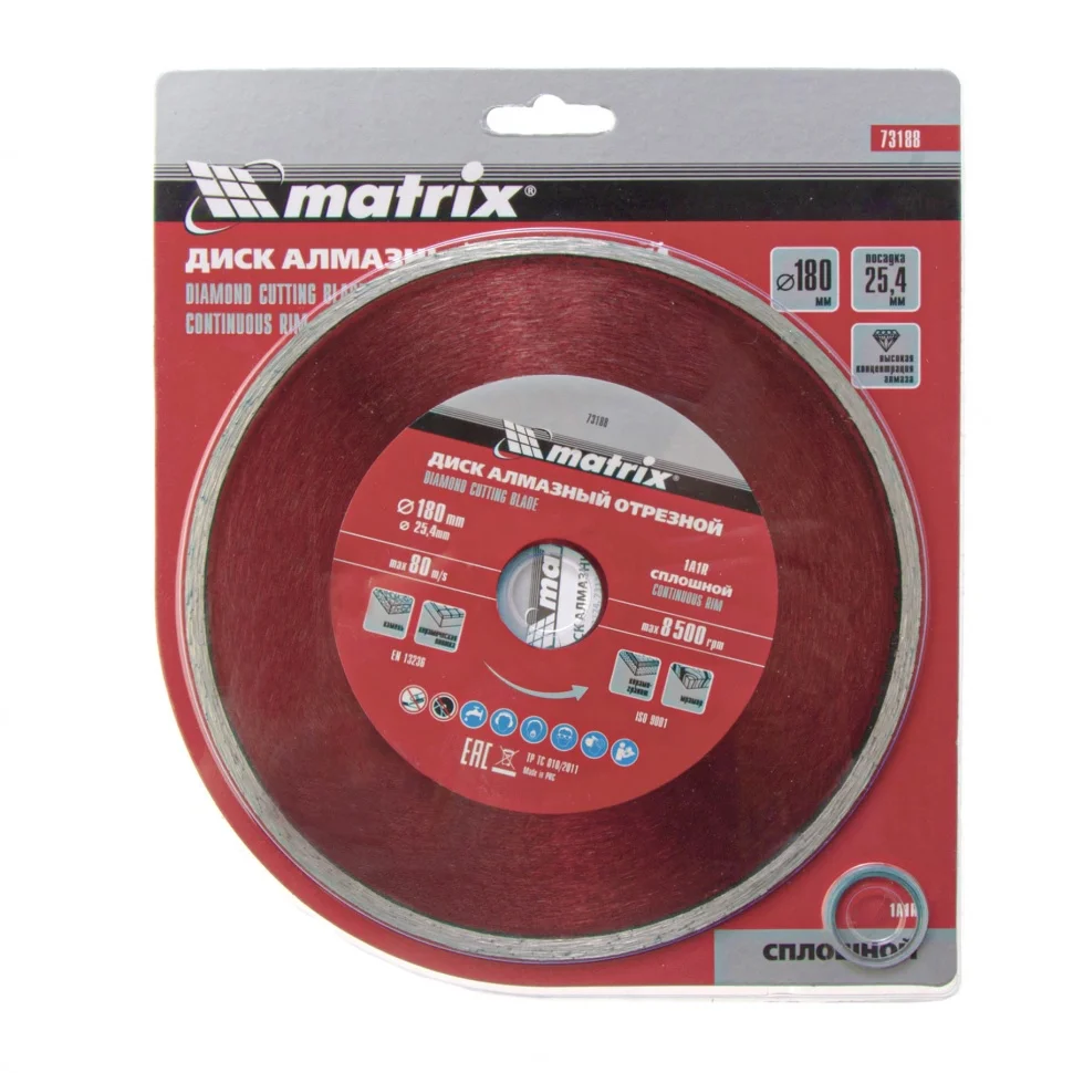 Диск алмазный отрезной сплошной Matrix 73188, 180 х 25,4 мм, предназначен для мокрого реза мрамора, керамической плитки, керамогранита, натурального или искусственного камня. Устанавливается на углошлифовальные машины и плиткорезы с посадочным диаметром 25,4 мм. Благодаря использованию водяного охлаждения улучшается качество реза, а также продлевается срок службы диска.ПреимуществаБлагодаря сплошной кромке и использованию водяного охлаждения срез получается ровным, без сколов и трещин.За счет качественного исполнения методом холодного прессования диск долго сохраняет режущие свойства.Связка из металлических компонентов надежно удерживает алмазы, что обеспечивает высокий рабочий ресурс.Рабочий слой шириной 6 мм с высокой концентрацией алмазов гарантирует хорошую производительность диска.