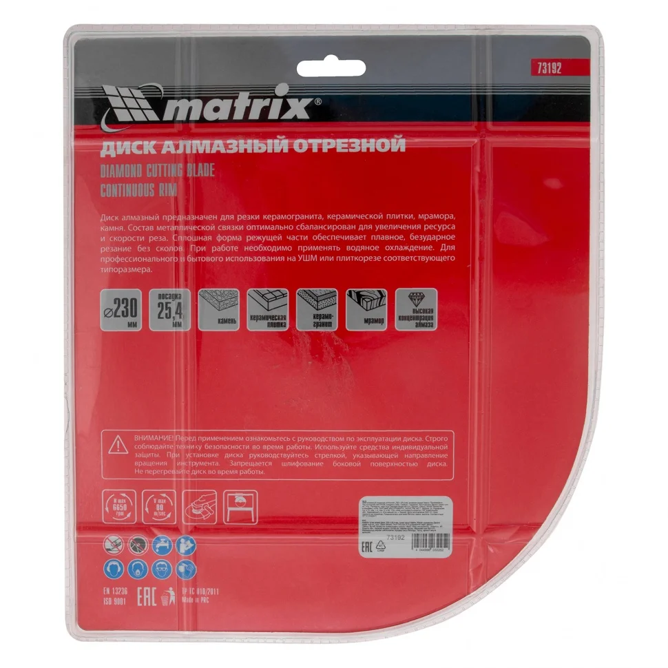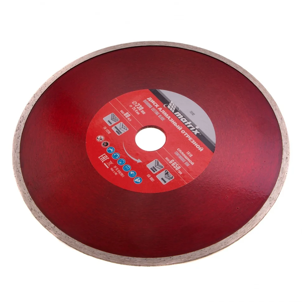 Диск алмазный отрезной сплошной Matrix 73192, 230 х 25,4 мм, предназначен для мокрого реза мрамора, керамической плитки, керамогранита, натурального или искусственного камня. Устанавливается на углошлифовальные машины и плиткорезы с посадочным диаметром 25,4 мм. Благодаря использованию водяного охлаждения улучшается качество реза, а также продлевается срок службы диска.ПреимуществаБлагодаря сплошной кромке и использованию водяного охлаждения срез получается ровным, без сколов и трещин.За счет качественного исполнения методом холодного прессования диск долго сохраняет режущие свойства.Связка из металлических компонентов надежно удерживает алмазы, что обеспечивает высокий рабочий ресурс.Рабочий слой шириной 6 мм с высокой концентрацией алмазов гарантирует хорошую производительность диска.