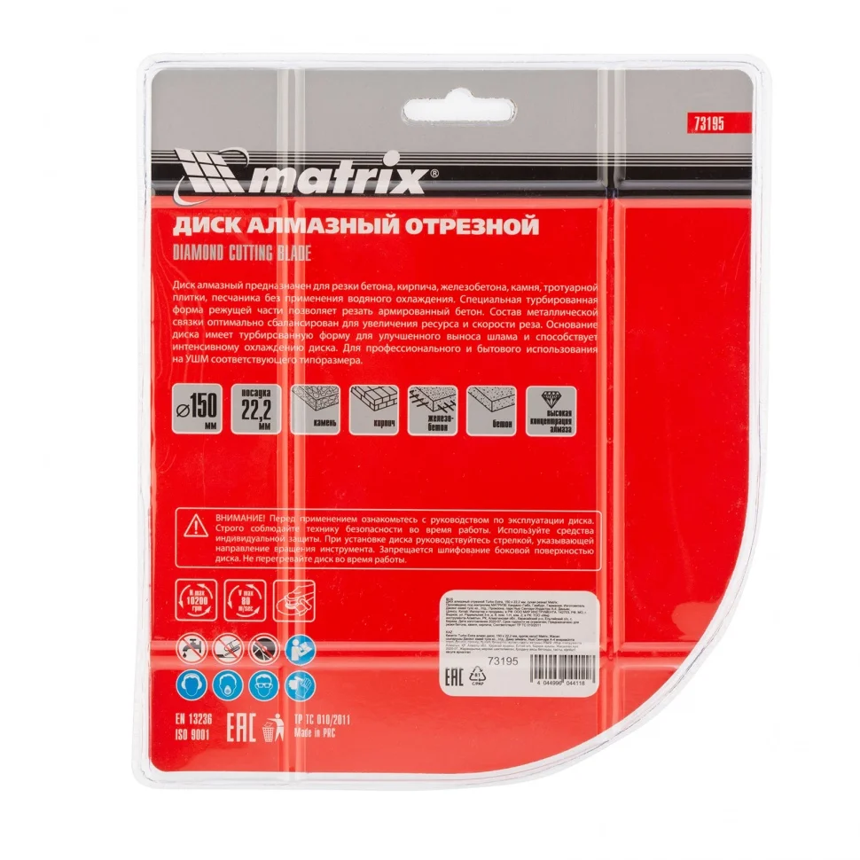Отрезной алмазный диск Matrix Turbo Extra 73195, 150 х 22,2 мм, используется для сухой резки бетона, железобетона, кирпича, тротуарной плитки, шлакоблока и камня. Он устанавливается на углошлифовальные машины с посадочным диаметром 22,2 мм. Обеспечивает высокую скорость реза, поэтому подходит для интенсивного применения.ПреимуществаЭкстратурбированная форма - в процессе реза обеспечивается эффективное охлаждение и удаление шлама.Повышенная производительность - рабочий слой шириной 7 мм состоит из синтетических алмазов высокого качества.Оптимально сбалансированный состав связки - режущий слой равномерно стачивается, своевременно вскрывая новые алмазы.Эффективное решение бытовых и профессиональных задач - концентрация алмазов повышена, диск рассчитан на долгую эксплуатацию.