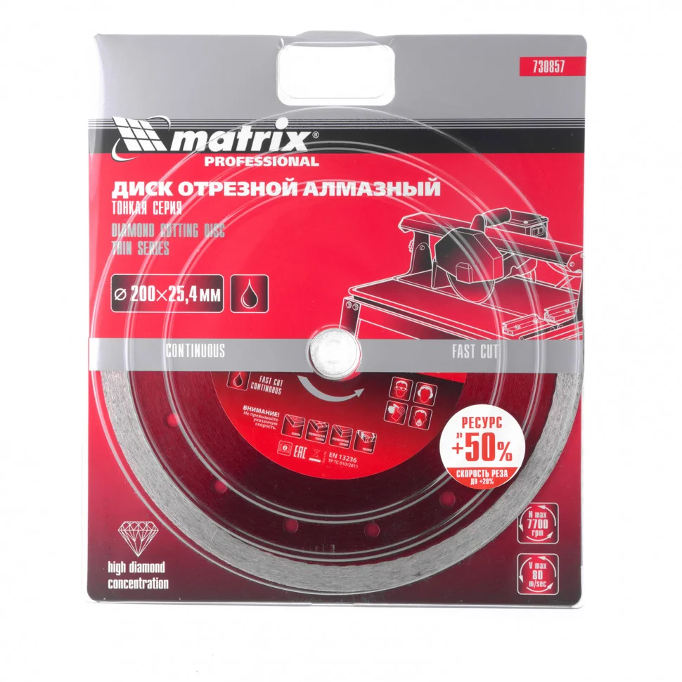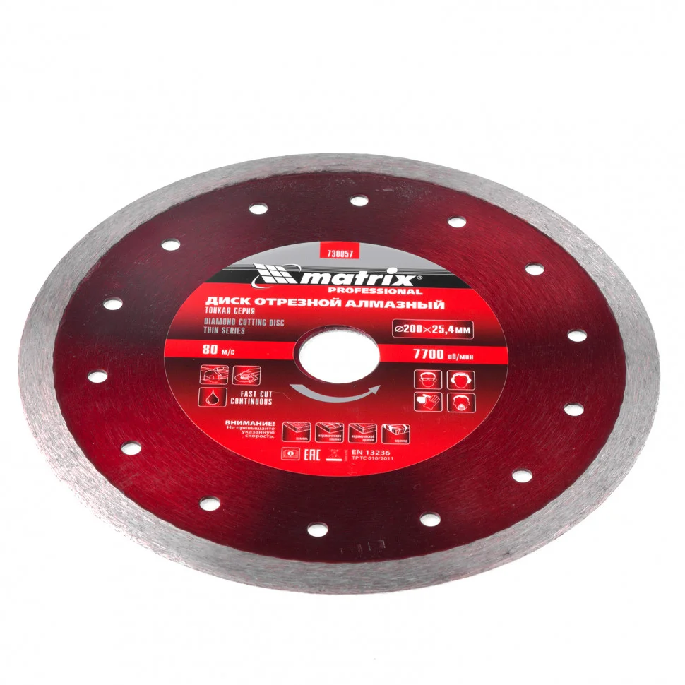 Тонкий сплошной алмазный диск Matrix 200 х 25,4 мм 730857, тонкий, обеспечивает мокрое резание плотных материалов: керамогранита, керамической и кафельной плитки, мрамора, натурального и искусственного камня. Он устанавливается на УШМ или плиткорезы и используется с применением водяного охлаждения. Диск увеличивает производительность на 20% благодаря небольшой толщине 2,1 мм и снижению нагрузки на инструмент.ПреимуществаСплошная форма и перфорированный корпус позволяют добиться высокого качества реза и предотвращают появление сколов.Режущая часть шириной 10 мм с высокой концентрацией алмазов способствуют увеличению рабочего ресурса диска на 50%.Высокий ресурс и износостойкость рабочей части достигается за счет металлической связки.Метод ускоренного горячего прессования улучшает сопротивление режущей части нагрузкам и делает мокрое резание более качественным.Диск может использоваться в бытовых целях и профессионально.