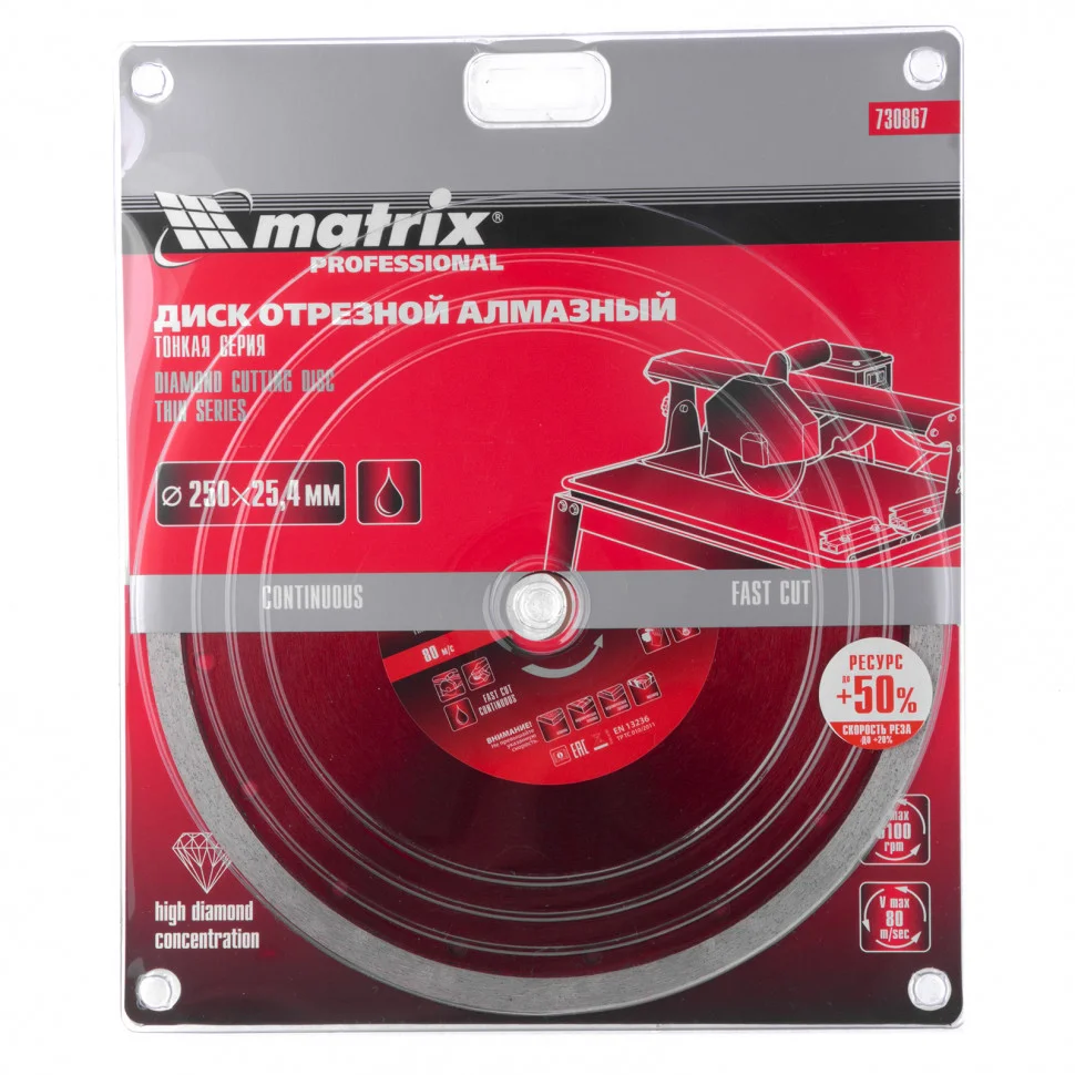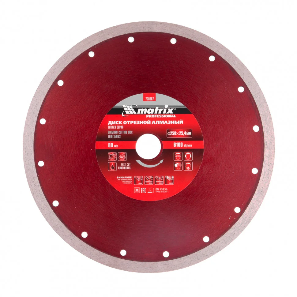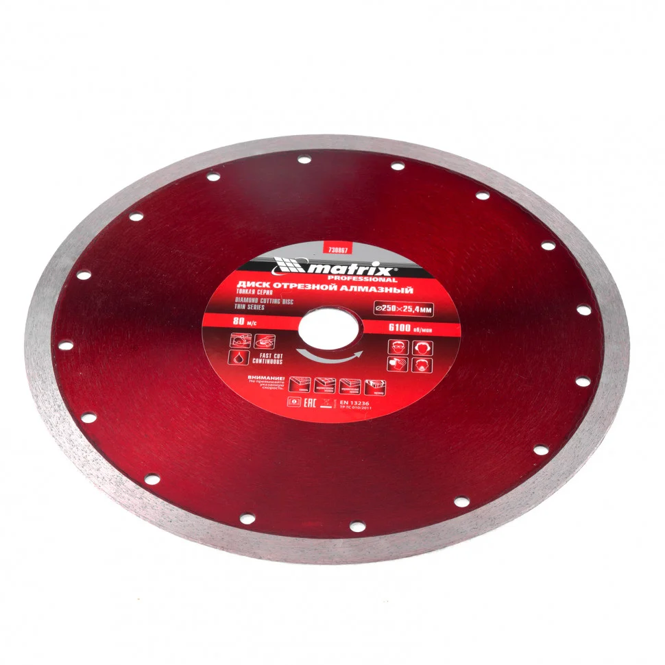 Тонкий сплошной алмазный диск Matrix 250 х 25,4 мм 730867, тонкий, обеспечивает мокрое резание плотных материалов: керамогранита, керамической и кафельной плитки, мрамора, натурального и искусственного камня. Он устанавливается на УШМ или плиткорезы и используется с применением водяного охлаждения. Диск увеличивает производительность на 20% благодаря небольшой толщине 2,3 мм и снижению нагрузки на инструмент.ПреимуществаСплошная форма и перфорированный корпус позволяют добиться высокого качества реза и предотвращают появление сколов.Режущая часть шириной 10 мм с высокой концентрацией алмазов способствуют увеличению рабочего ресурса диска на 50%.Высокий ресурс и износостойкость рабочей части достигается за счет металлической связки.Метод ускоренного горячего прессования улучшает сопротивление режущей части нагрузкам и делает мокрое резание более качественным.Диск может использоваться в бытовых целях и профессионально.