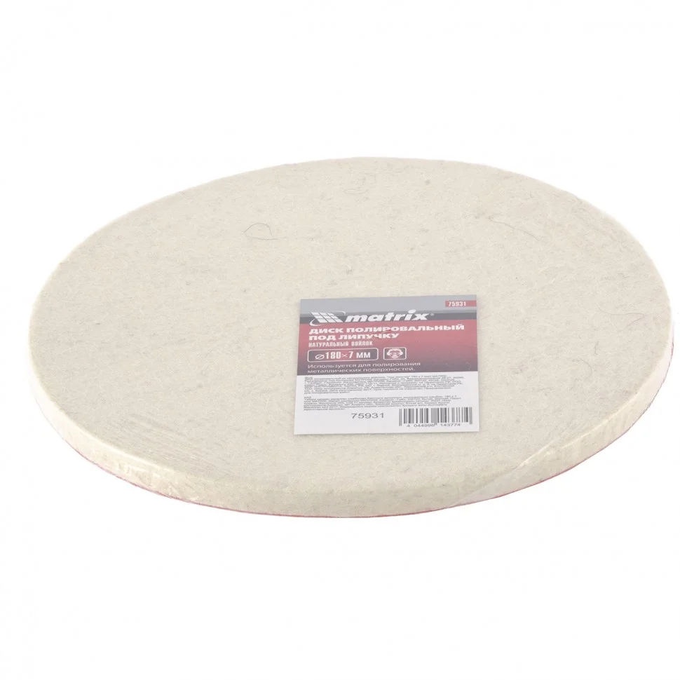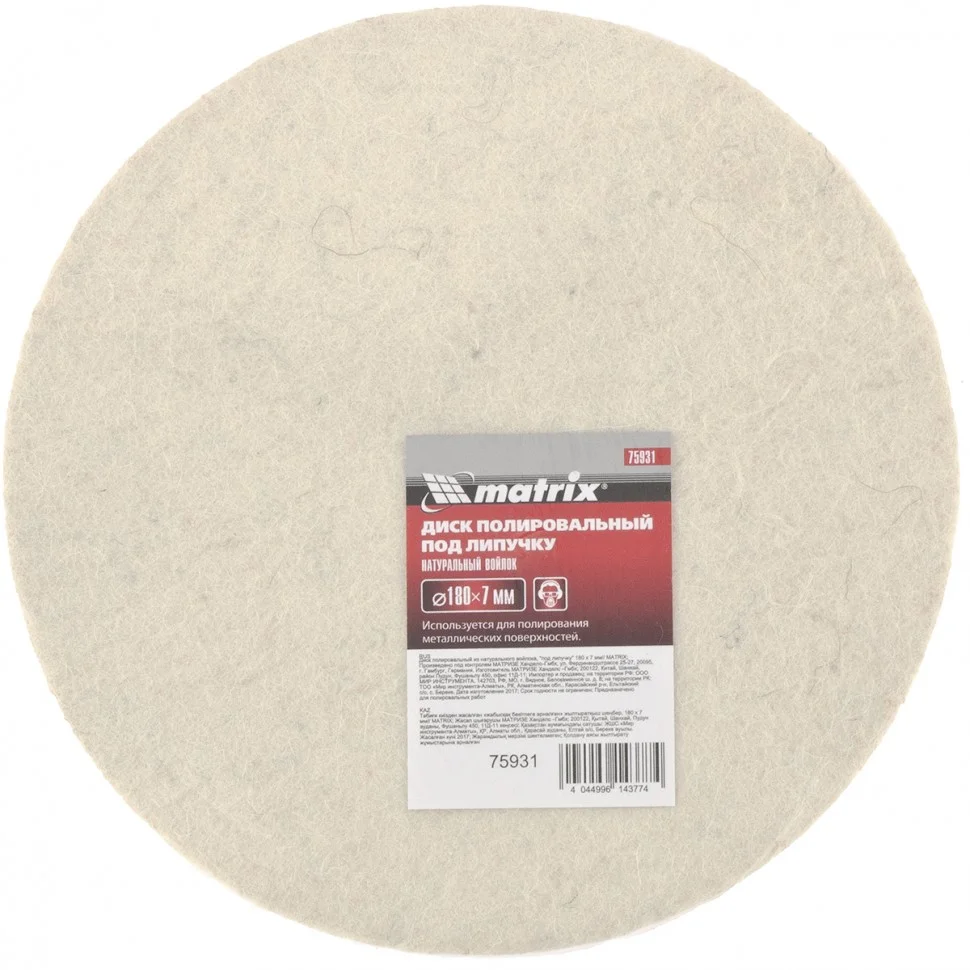 Полировальный диск под «липучку» Matrix арт. 75931 предназначен для тонких работ по металлу, стеклу, камню, пластмассе. Он устанавливается на полировальные машины, углошлифовальные машинки или дрели совместно с опорной тарелкой (насадкой) диаметром 180 мм. Диск изготовлен из натурального войлока, оптимального для полировки материалов, сглаживания микротрещин, придания поверхности блеска, в том числе после обработки мелкозернистым абразивом.ПреимуществаНатуральный войлок обеспечивает эластичность, прочность и износостойкость диска, поэтому прослужит долго.Натуральная шерсть эффективно рассеивает тепло, а значит, препятствует перегреву обрабатываемой поверхности.Благодаря креплению под «липучку» диск легко надевается на подошву шлифмашины (опорной тарелки) и надежно удерживается даже на высокой скорости.Диск можно использовать с полировочными пастами для достижения максимального эффекта.