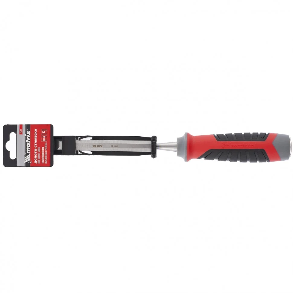 Долото-стамеска Matrix 24747, 60 CrV, с шириной полотна 12 мм и трехкомпонентной обрезиненной рукояткой используется в столярном и мебельном производстве. Оно позволяет выбрать углубления, снять фаски, зачистить пазы, создать декоративную резьбу на деревянной поверхности. Благодаря металлическому затыльнику долото-стамеску можно использовать с ударным инструментом для лучшего врезания в дерево.ПреимуществаПолотно выполнено из высокопрочной стали хромованадиевой группы, поэтому обладает износостойкостью и долговечностью.Твердость рабочей части полотна составляет 55 HRC (не менее 2/3 длины) - лезвие долго не тупится и гарантирует получение аккуратного контура.Заточка лезвия произведена на заводе под углом 20-35°, мастеру нужно лишь поддерживать остроту 1-2 раза в год.Обрезиненная трехкомпонентная рукоятка с рельефным дизайном препятствует скольжению руки, за счет чего работать с инструментом комфортно и безопасно.Долото-стамеска Matrix отличается высоким качеством исполнения, поэтому оптимально подходит для профессионального использования.