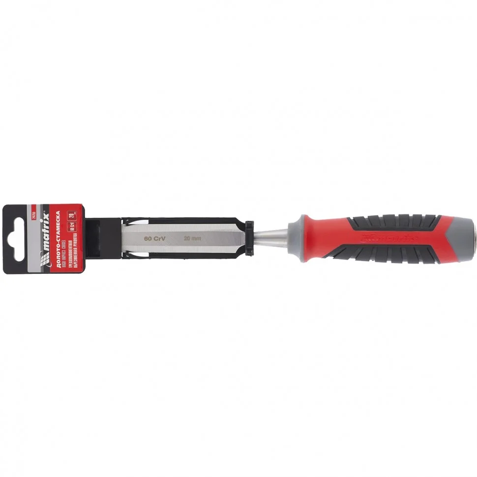Долото-стамеска Matrix 24755, 60 CrV, с шириной полотна 20 мм и трехкомпонентной обрезиненной рукояткой используется в столярном и мебельном производстве. Оно позволяет выбрать углубления, снять фаски, зачистить пазы, создать декоративную резьбу на деревянной поверхности. Благодаря металлическому затыльнику долото-стамеску можно использовать с ударным инструментом для лучшего врезания в дерево.ПреимуществаПолотно выполнено из высокопрочной стали хромованадиевой группы, поэтому обладает износостойкостью и долговечностью.Твердость рабочей части полотна составляет 55 HRC (не менее 2/3 длины) - лезвие долго не тупится и гарантирует получение аккуратного контура.Заточка лезвия произведена на заводе под углом 20-35°, мастеру нужно лишь поддерживать остроту 1-2 раза в год.Обрезиненная трехкомпонентная рукоятка с рельефным дизайном препятствует скольжению руки, за счет чего работать с инструментом комфортно и безопасно.Долото-стамеска Matrix отличается высоким качеством исполнения, поэтому оптимально подходит для профессионального использования.