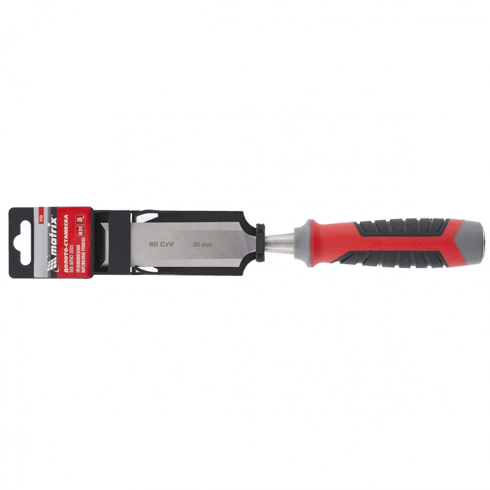 Долото-стамеска Matrix 24765, 60 CrV, с шириной полотна 30 мм и трехкомпонентной обрезиненной рукояткой используется в столярном и мебельном производстве. Оно позволяет выбрать углубления, снять фаски, зачистить пазы, создать декоративную резьбу на деревянной поверхности. Благодаря металлическому затыльнику долото-стамеску можно использовать с ударным инструментом для лучшего врезания в дерево.ПреимуществаПолотно выполнено из высокопрочной стали хромованадиевой группы, поэтому обладает износостойкостью и долговечностью.Твердость рабочей части полотна составляет 55 HRC (не менее 2/3 длины) - лезвие долго не тупится и гарантирует получение аккуратного контура.Заточка лезвия произведена на заводе под углом 20-35°, мастеру нужно лишь поддерживать остроту 1-2 раза в год.Обрезиненная трехкомпонентная рукоятка с рельефным дизайном препятствует скольжению руки, за счет чего работать с инструментом комфортно и безопасно.Долото-стамеска Matrix отличается высоким качеством исполнения, поэтому оптимально подходит для профессионального использования.
