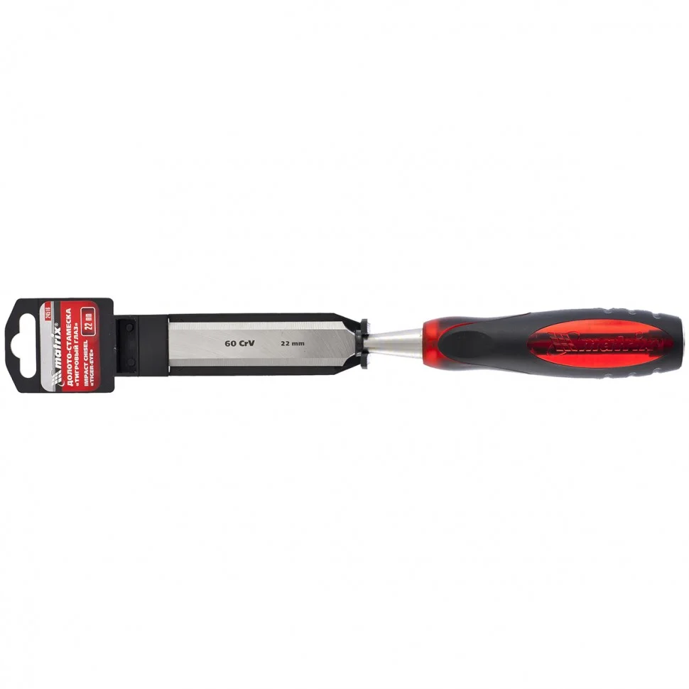 Долото-стамеска Matrix «Тигровый глаз» 24516, 22 мм, с двухкомпонентной обрезиненной рукояткой, используется в столярном и плотницком деле, в производстве мебели. С его помощью можно вырезать углубления, формировать пазы, зачищать шипы и гнезда, снимать фаски. Долото-стамеска выдерживает удары киянкой или молотком, т.к. металлический затыльник защищает его от деформации.ПреимуществаПолотно выполнено из легированной стали хромованадиевой группы, поэтому отличается повышенной прочностью, стойкостью к износу и позволяет добиться необходимой твердости инструмента.Долото-стамеска обладает твердостью 65 HRC (0,7 длины рабочей части полотна), поэтому длительное время сохраняет режущие свойства.Острое как бритва лезвие обработано на заводе под углом 20-35°, повторная заточка потребуется минимум через 6 месяцев.Конструкцией предусмотрен металлический стержень, проходящий сквозь рукоятку, что повышает прочность и долговечность инструмента.Двухкомпонентная рукоятка с резиновыми вставками и упорами под пальцы не скользит в руке и снижает усталость при работе.Долото относится к профессиональному ручному инструменту, но может применяться и в домашних условиях.
