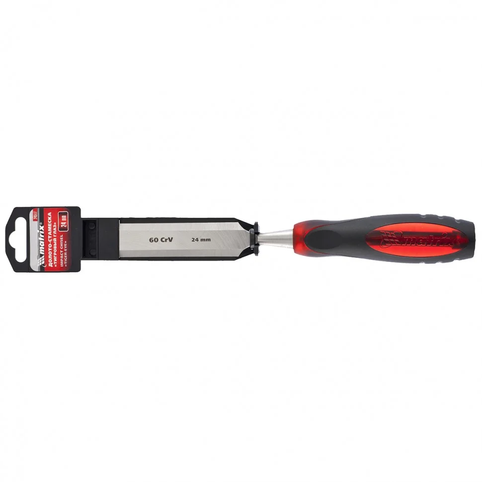 Долото-стамеска Matrix «Тигровый глаз» 24517, 24 мм, с двухкомпонентной обрезиненной рукояткой, используется в столярном и плотницком деле, в производстве мебели. С его помощью можно вырезать углубления, формировать пазы, зачищать шипы и гнезда, снимать фаски. Долото-стамеска выдерживает удары киянкой или молотком, т.к. металлический затыльник защищает его от деформации.ПреимуществаПолотно выполнено из легированной стали хромованадиевой группы, поэтому отличается повышенной прочностью, стойкостью к износу и позволяет добиться необходимой твердости инструмента.Долото-стамеска обладает твердостью 65 HRC (0,7 длины рабочей части полотна), поэтому длительное время сохраняет режущие свойства.Острое как бритва лезвие обработано на заводе под углом 20-35°, повторная заточка потребуется минимум через 6 месяцев.Конструкцией предусмотрен металлический стержень, проходящий сквозь рукоятку, что повышает прочность и долговечность инструмента.Двухкомпонентная рукоятка с резиновыми вставками и упорами под пальцы не скользит в руке и снижает усталость при работе.Долото относится к профессиональному ручному инструменту, но может применяться и в домашних условиях.