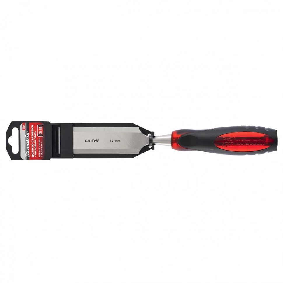 Долото-стамеска Matrix «Тигровый глаз» 24521, 32 мм, с двухкомпонентной обрезиненной рукояткой, используется в столярном и плотницком деле, в производстве мебели. С его помощью можно вырезать углубления, формировать пазы, зачищать шипы и гнезда, снимать фаски. Долото-стамеска выдерживает удары киянкой или молотком, т.к. металлический затыльник защищает его от деформации.ПреимуществаПолотно выполнено из легированной стали хромованадиевой группы, поэтому отличается повышенной прочностью, стойкостью к износу и позволяет добиться необходимой твердости инструмента.Долото-стамеска обладает твердостью 65 HRC (0,7 длины рабочей части полотна), поэтому длительное время сохраняет режущие свойства.Острое как бритва лезвие обработано на заводе под углом 20-35°, повторная заточка потребуется минимум через 6 месяцев.Конструкцией предусмотрен металлический стержень, проходящий сквозь рукоятку, что повышает прочность и долговечность инструмента.Двухкомпонентная рукоятка с резиновыми вставками и упорами под пальцы не скользит в руке и снижает усталость при работе.Долото относится к профессиональному ручному инструменту, но может применяться и в домашних условиях.
