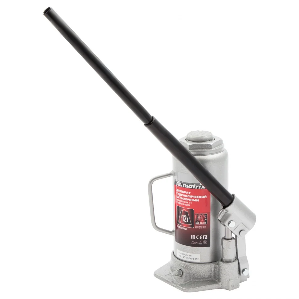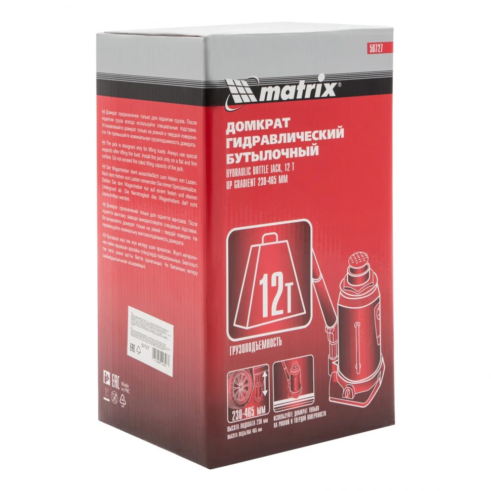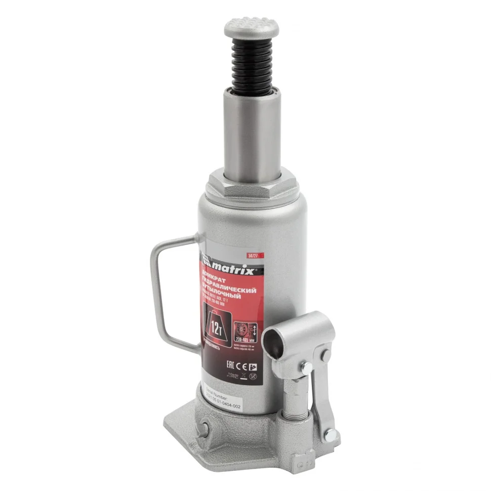 Гидравлический бутылочный домкрат Matrix 50727 используется для поднятия и фиксации грузов весом до 12 т на высоту 230-465 мм. Он подходит для автомобилей с высоким клиренсом. Домкрат станет незаменимым помощником для автолюбителей в гараже и дороге, а также для профессионалов на СТО.ПреимуществаЗащиту от перегрузок обеспечивает клапан безопасности, не допускающий поднятия веса более допустимого.Чугунное основание и стальной корпус гарантируют надежность домкрата.Резьбовое соединение основания и корпуса обеспечивает возможность ремонта конструкции при необходимости.