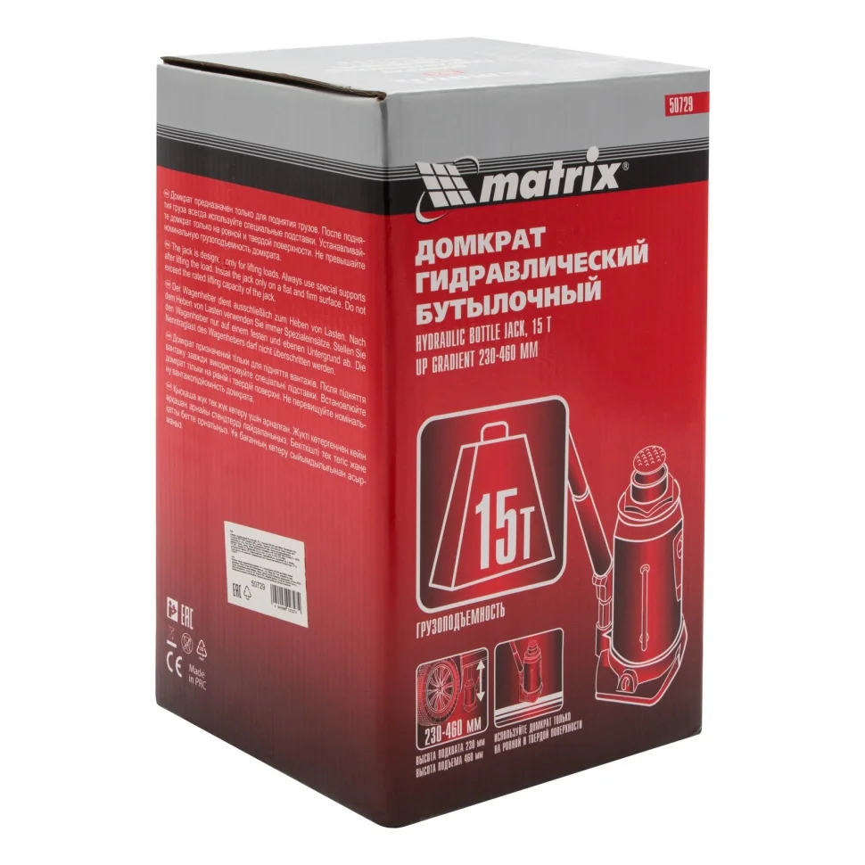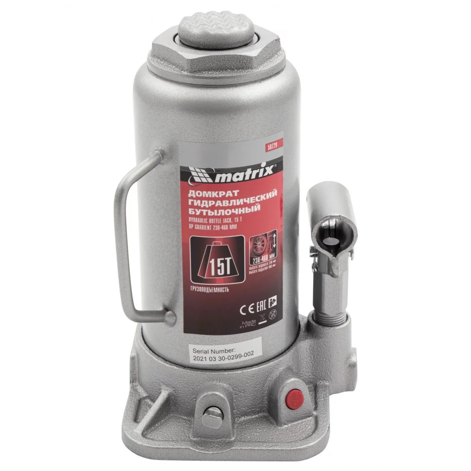 Гидравлический бутылочный домкрат Matrix 50729 используется для поднятия грузов массой до 15 т на высоту 230-460 мм. Подходит для автомобилей с высоким клиренсом. Домкрат будет полезен автолюбителям в гараже и дороге, а также сотрудникам СТО.ПреимуществаЗащита от перегрузок — клапан безопасности предотвращает подъем груза массой более 15 т.Надежная конструкция — домкрат имеет чугунное основание и стальной корпус.Ремонтопригодность — благодаря резьбовому соединению при необходимости корпус можно снять со станины.