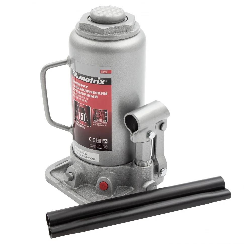 Домкрат гидравлический бутылочный, 15 т, высота подъема 230-460 мм Matrix 50729