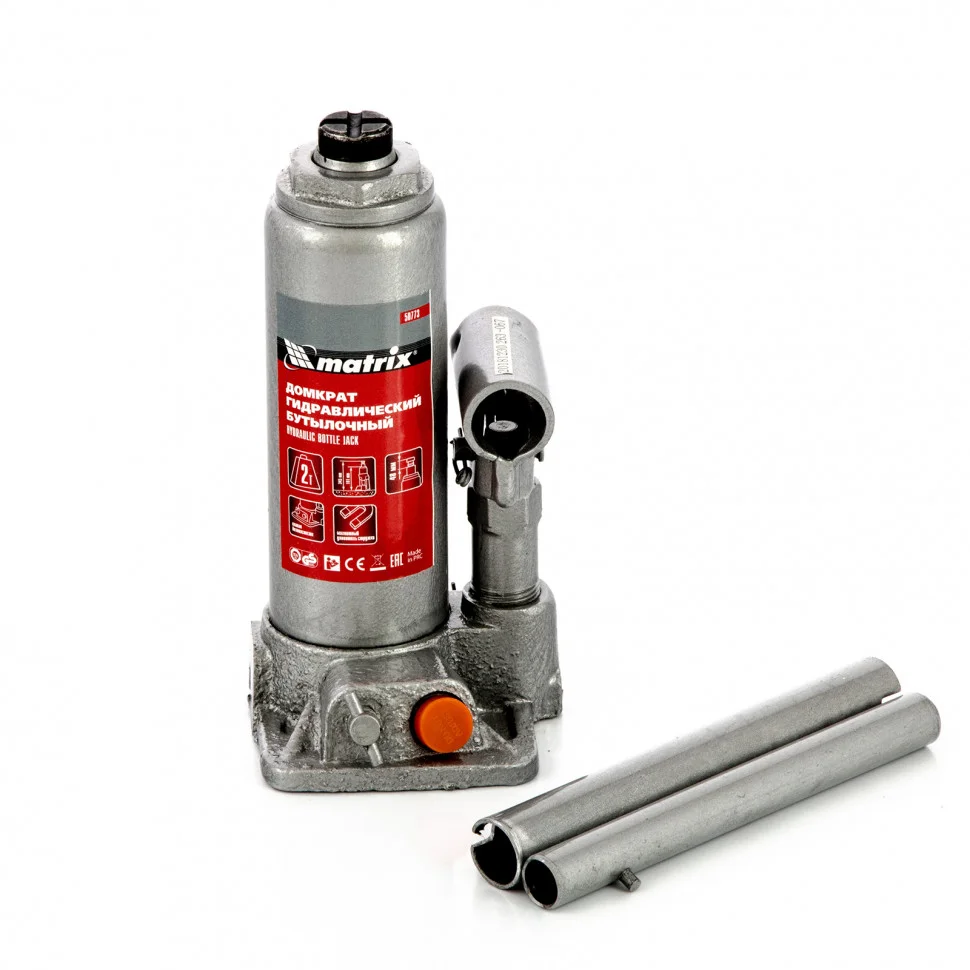 Гидравлический бутылочный домкрат Matrix 50773 обеспечивает быстрое поднятие грузов массой до 2 т на высоту 181-345 мм. Он оснащен встроенным магнитным уловителем, который собирает металлическую стружку, предотвращая износ резиновых уплотнителей. С помощью домкрата можно произвести ремонт авто.ПреимуществаКлапан безопасности - домкрат не подвержен перегрузкам, т.к. не поднимает вес свыше установленной нормы.Долговечность и надежность - домкрат выполнен из высокопрочной коррозионностойкой стали.Разборная конструкция - корпус можно отсоединить от станины при необходимости ремонта или прочистки домкрата.Удобство транспортировки - в комплекте с домкратом идет пластиковый кейс.