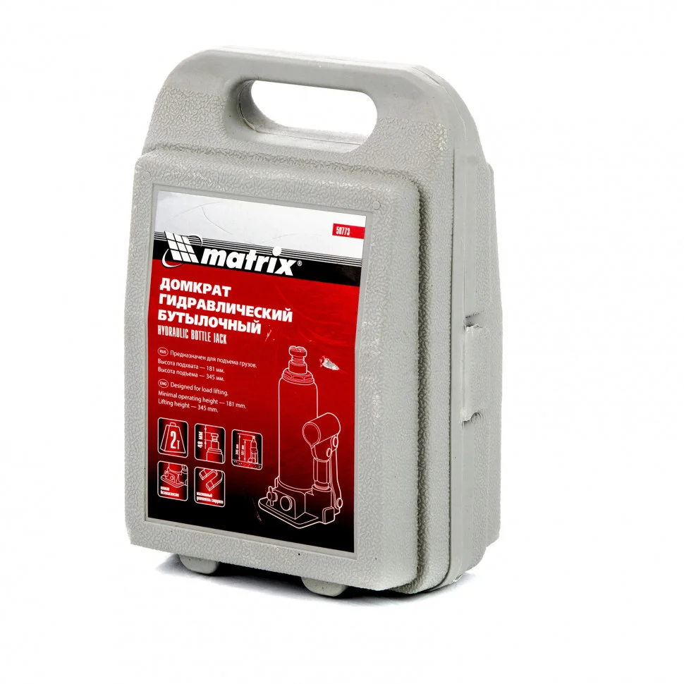 Домкрат гидравлический бутылочный, 2 т, h подъема 181-345 мм, в пластиковом кейсе Matrix 50773
