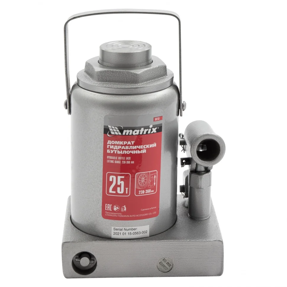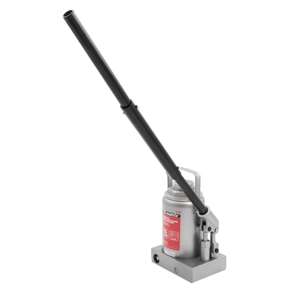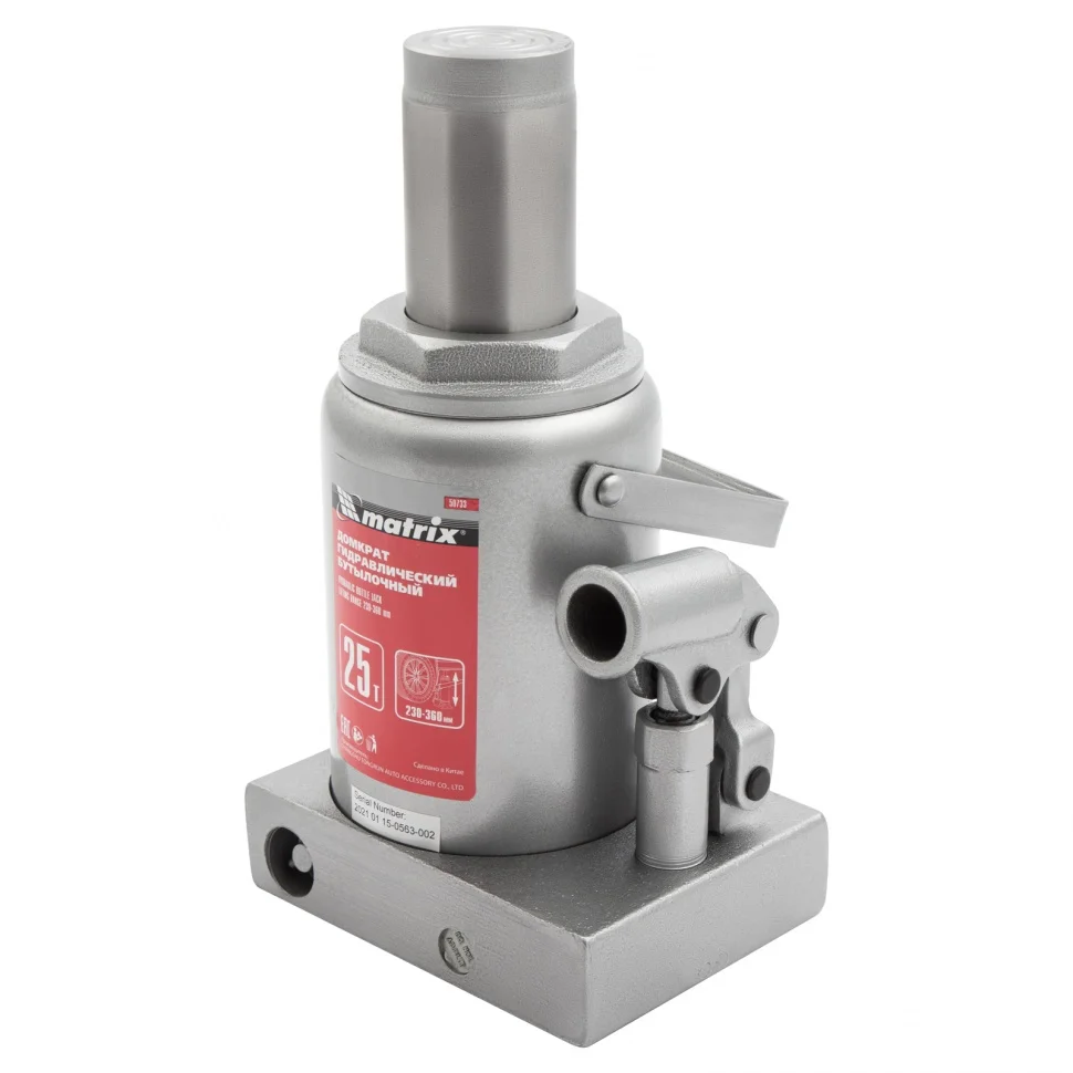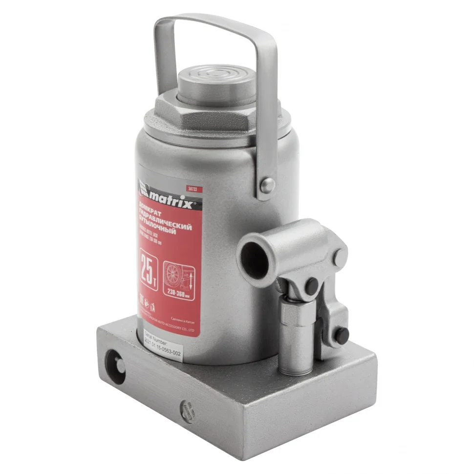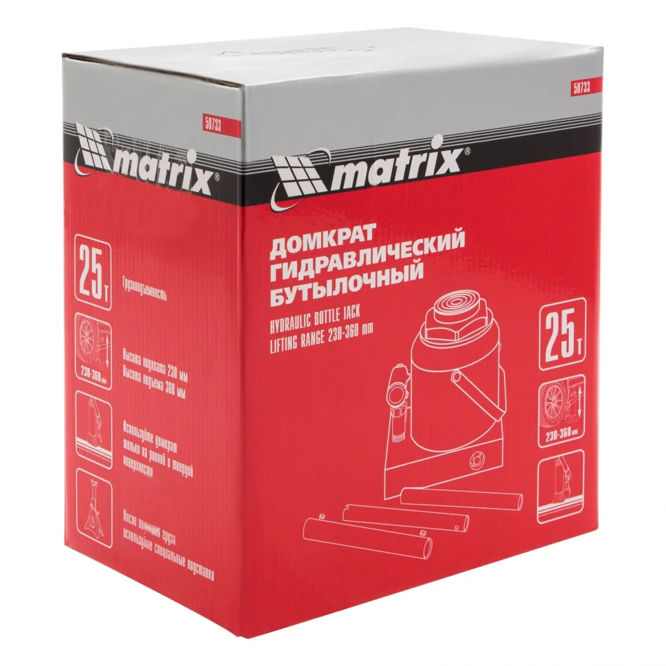 Гидравлический бутылочный домкрат Matrix 50733 используется для поднятия и фиксации грузов весом до 25 т на высоту 230-360 мм. Он подходит для автомобилей с высоким клиренсом. Домкрат станет незаменимым помощником для автолюбителей в гараже и дороге, а также для профессионалов на СТО.ПреимуществаЗащиту от перегрузок обеспечивает клапан безопасности, не допускающий поднятия веса более допустимого.Чугунное основание и стальной корпус гарантируют надежность домкрата.Резьбовое соединение основания и корпуса обеспечивает возможность ремонта конструкции при необходимости.