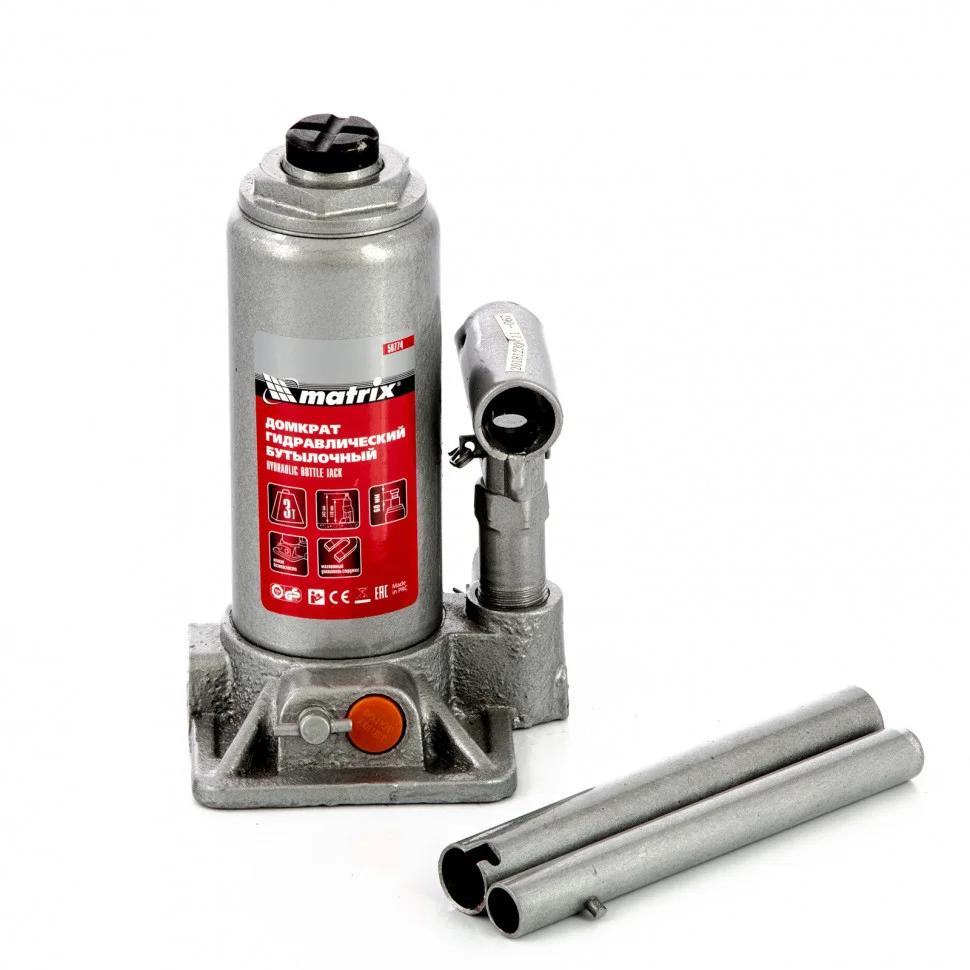 Гидравлический бутылочный домкрат Matrix 50774 обеспечивает быстрое поднятие грузов массой до 3 т на высоту 178-343 мм. Он оснащен встроенным магнитным уловителем, который собирает металлическую стружку, предотвращая износ резиновых уплотнителей. С помощью домкрата можно произвести ремонт авто.ПреимуществаКлапан безопасности - домкрат не подвержен перегрузкам, т.к. не поднимает вес свыше установленной нормы.Долговечность и надежность - домкрат выполнен из высокопрочной коррозионностойкой стали.Разборная конструкция - корпус можно отсоединить от станины при необходимости ремонта или прочистки домкрата.Удобство транспортировки - в комплекте с домкратом идет пластиковый кейс.