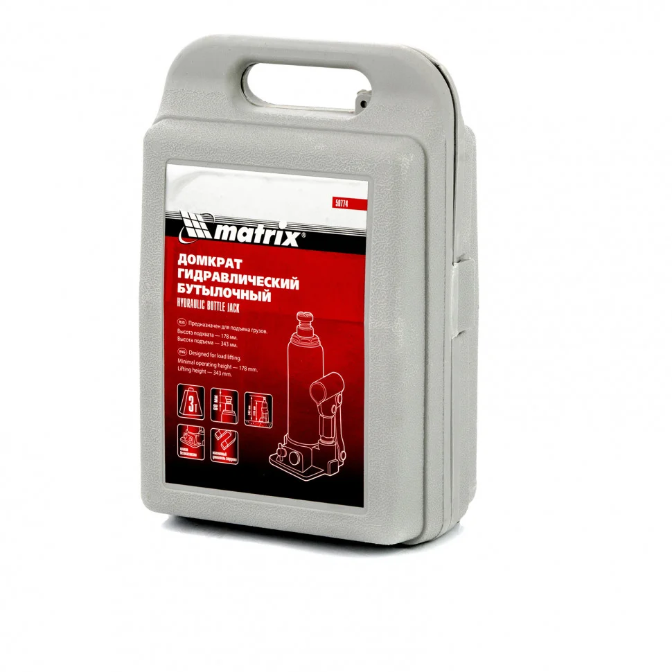 Домкрат гидравлический бутылочный, 3 т, h подъема 178-343 мм, в пластиковом кейсе Matrix 50774