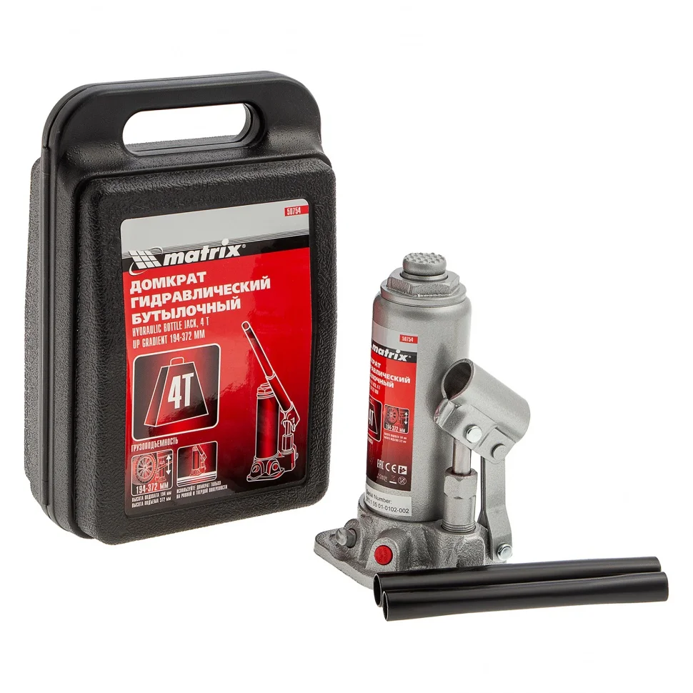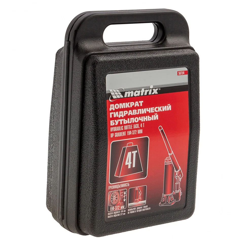 Домкрат гидравлический бутылочный, 4 т, высота подъема 194-372 мм, в пластиковый кейсе Matrix 50754