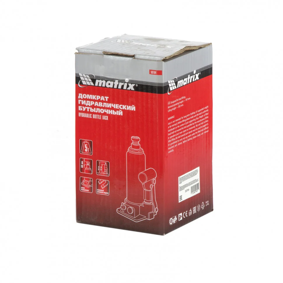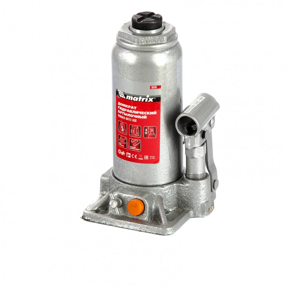 Домкрат гидравлический бутылочный Matrix 50764 предназначен для быстрого поднятия грузов весом до 5 т на высоту 197-382 мм. Он будет полезен автолюбителям и мастерам СТО в качестве полупрофессионального инструмента. Встроенный магнитный уловитель не допускает распространения металлической стружки по домкрату, таким образом обеспечивается защита резиновых уплотнителей от повреждений.ПреимуществаЗащита от перегрузки - домкрат оснащен клапаном безопасности, который не допускает поднятия массы свыше допустимой нормы.Высокий ресурс - домкрат выполнен из прочной коррозионностойкой стали.Разборный корпус - можно отремонтировать домкрат, если возникнет такая необходимость.Вес 4,2 кг - домкрат легко помещается в багажник авто.