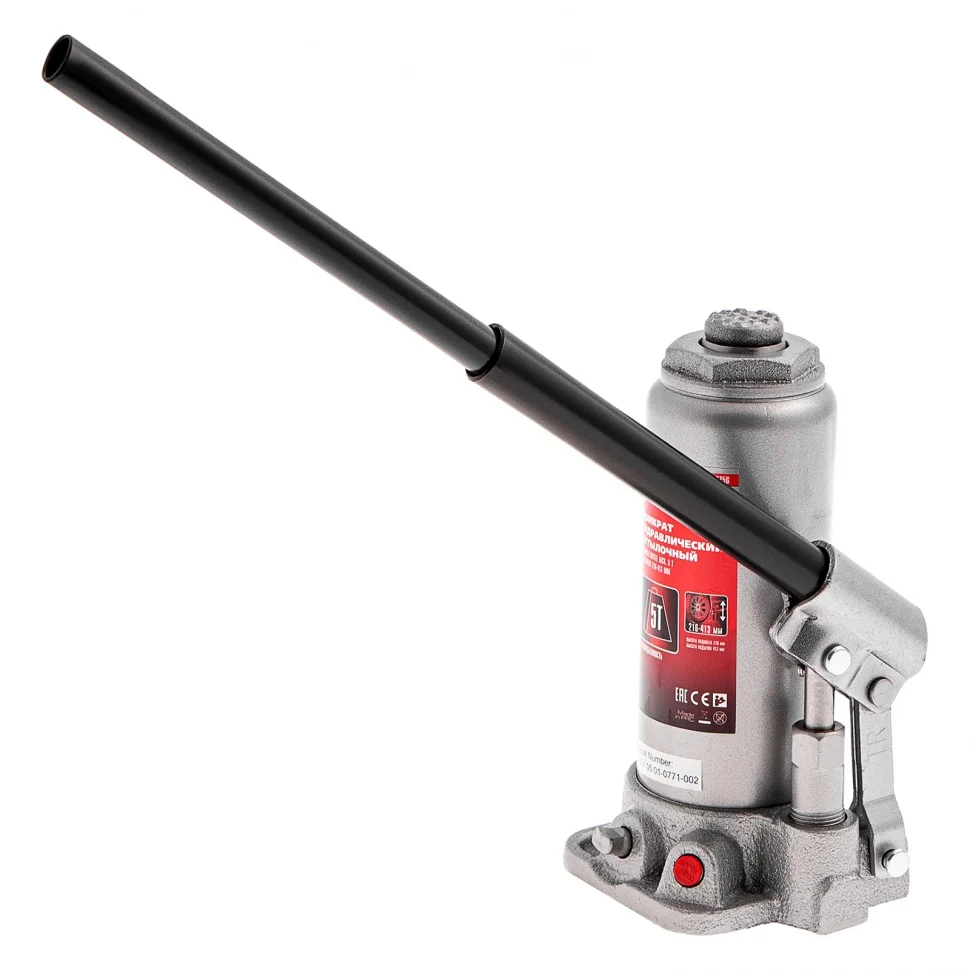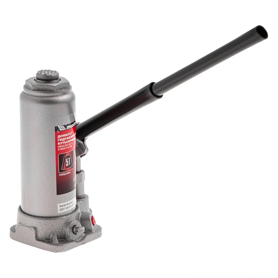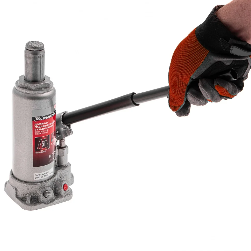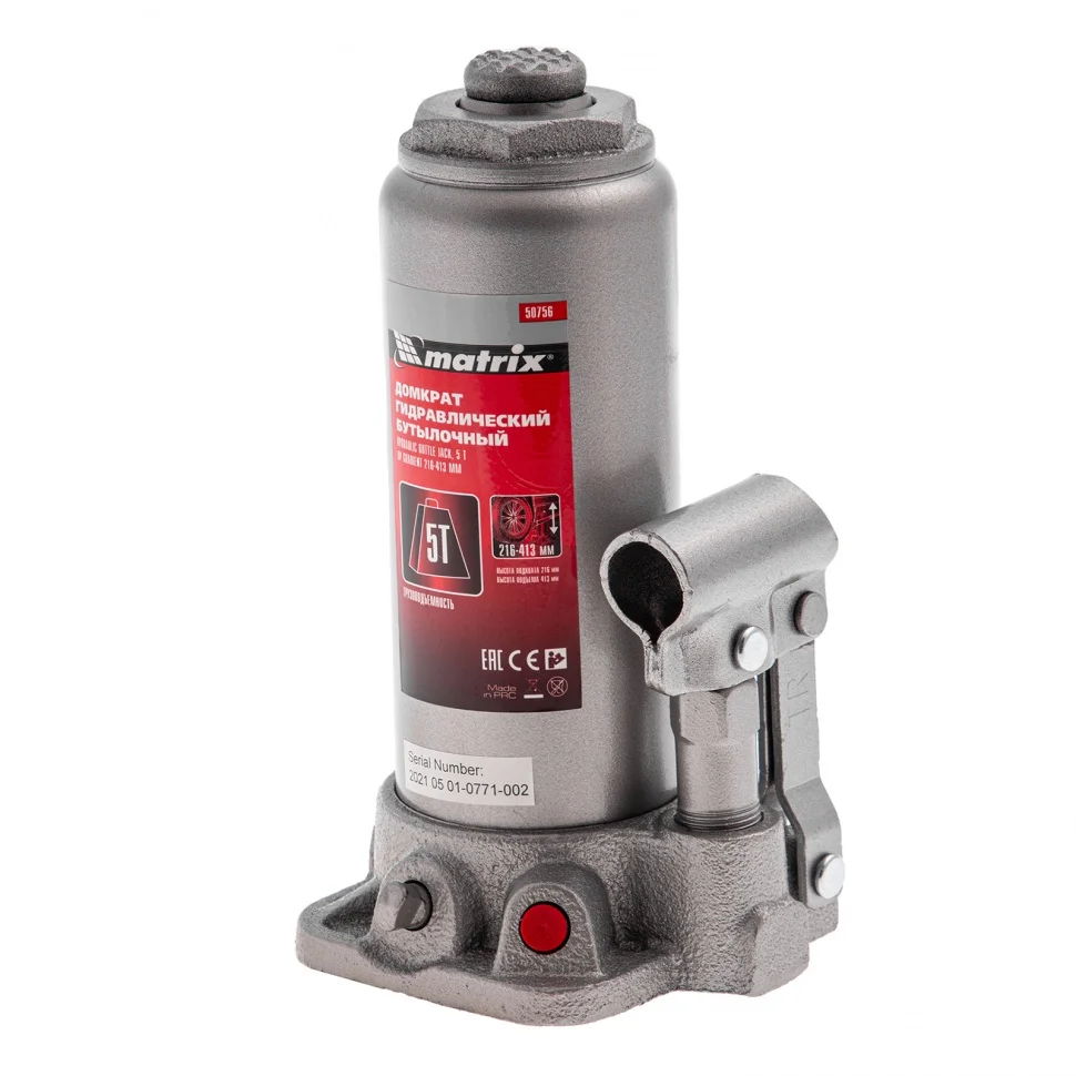 Гидравлический бутылочный домкрат Matrix 50756 поднимает грузы массой до 5 т на высоту от 216 до 413 мм. Оптимален для машин с большим клиренсом, поставляется в пластиковом кейсе. Будет полезен автолюбителям при проведении технического обслуживания и ремонте авто в дороге или в гараже. Также домкрат подходит для полупрофессионального применения на станциях ТО.Преимущества Защита от перегрузки — при превышении допустимой массы груза 5000 кг срабатывает клапан безопасности. Прочность и долговечность — станина выполнена из чугуна, а корпус — из стали. Ремонтопригодность — при необходимости корпус можно снимать со станины. Удобное хранение и транспортировка — домкрат поставляется в прочном пластиковом кейсе с ручкой.